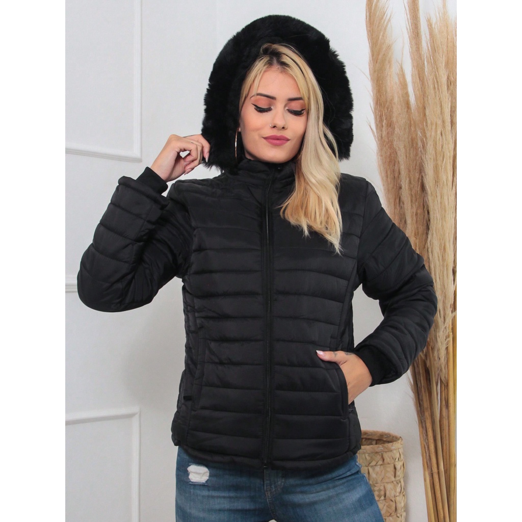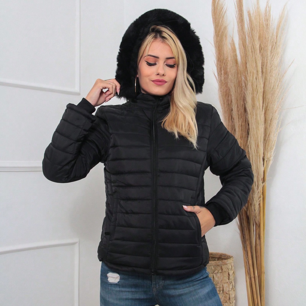 Jaqueta Puffer Feminina Inverno Forrada Capuz Bolsos Preta Lançamento