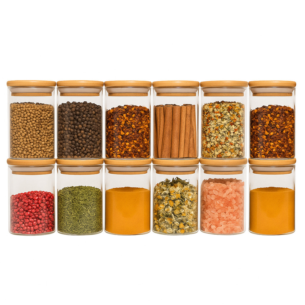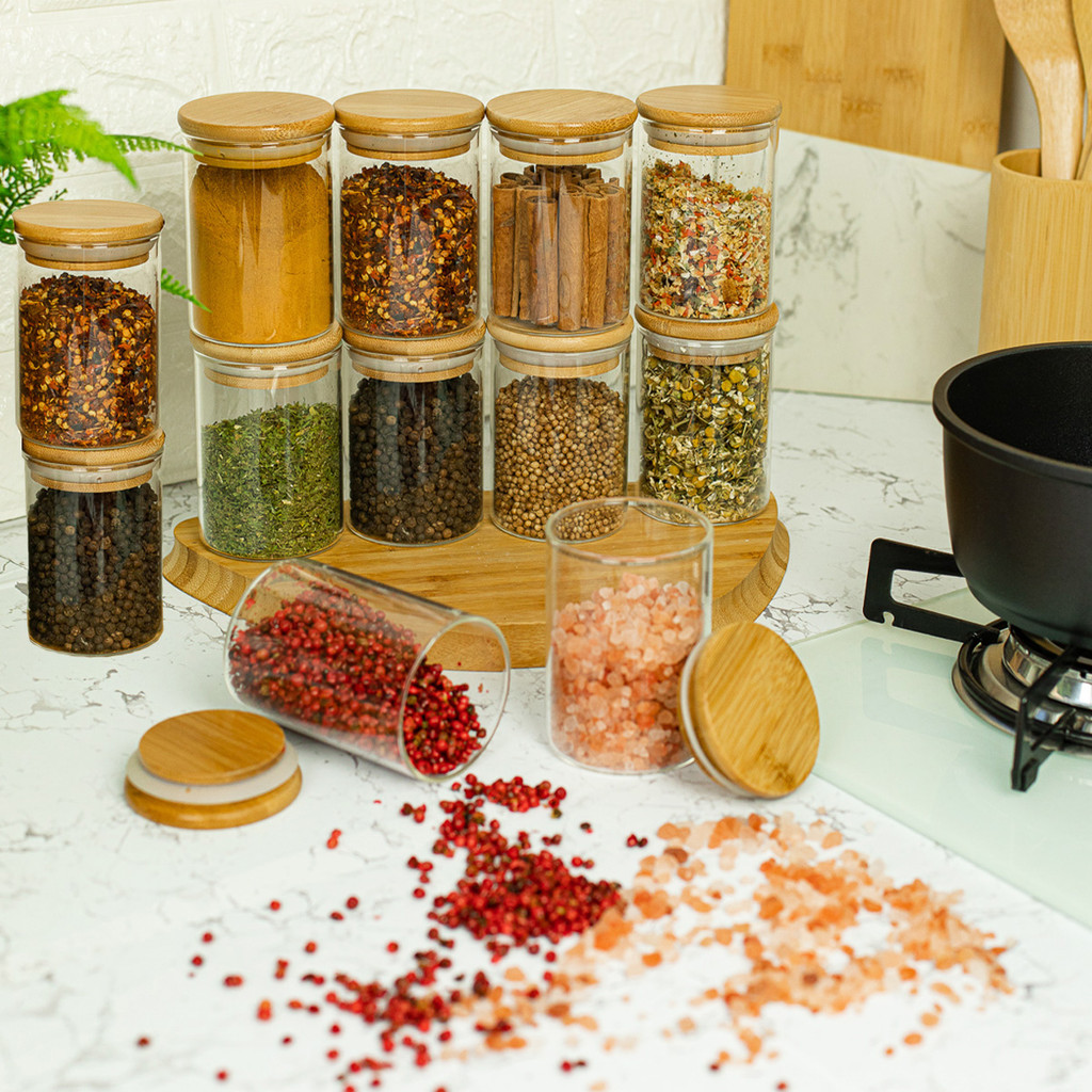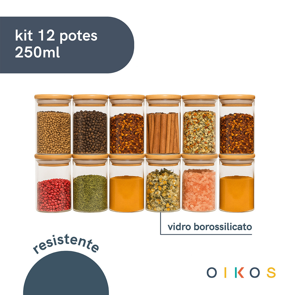 Jogo 12 potes de vidro 250ml com tampa de bambu herméticos para tempero - Oikos