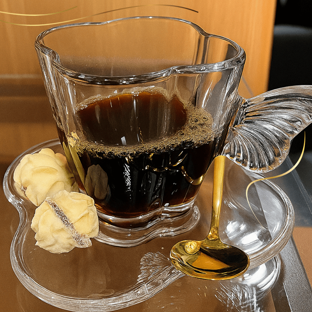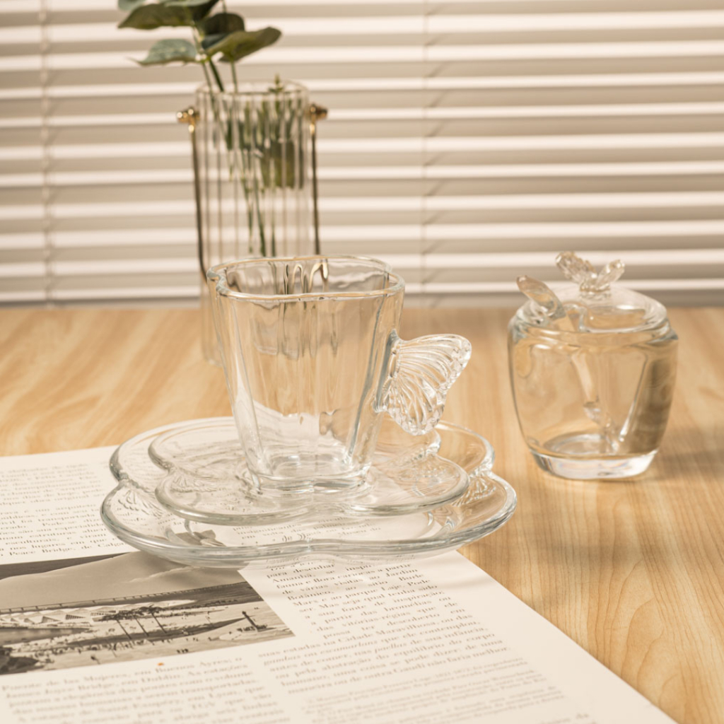 Jogo 4 Xícaras Chá Café Vidro Transparente Com Pires Butterfly Borboleta Wolff 180ml