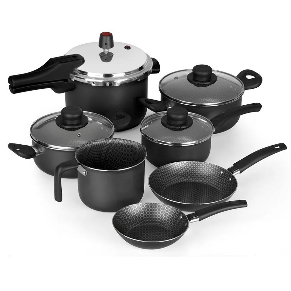 Jogo 7 Peças Antiaderente Preto Multiflon com Panela Pressão