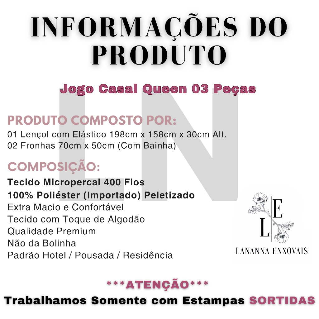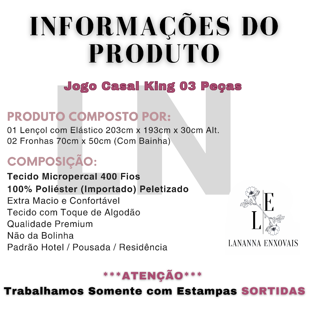 Jogo De Lençol King , Queen e Casal 400 Fios 3 Peças Ponto Palito Estampados Extra Macio