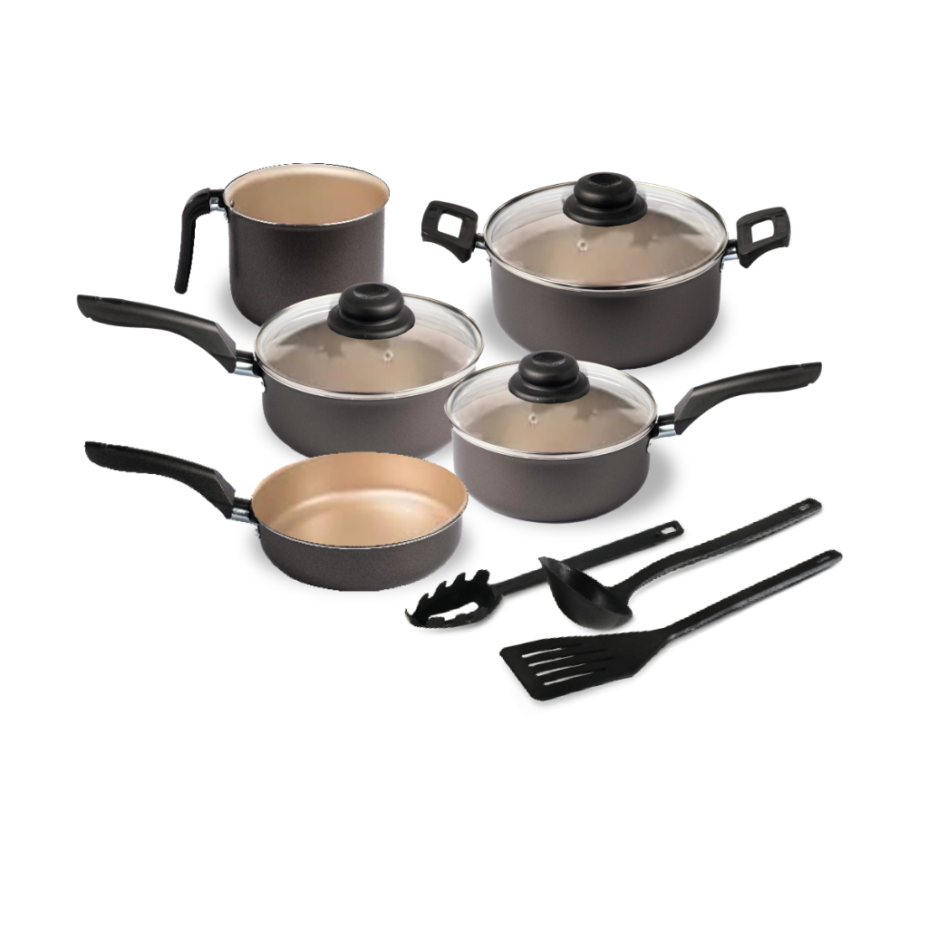 Jogo De Panelas D'ITÁLIA 08 Peças Antiaderente Teflon com Tampa de Vidro e Utensílios