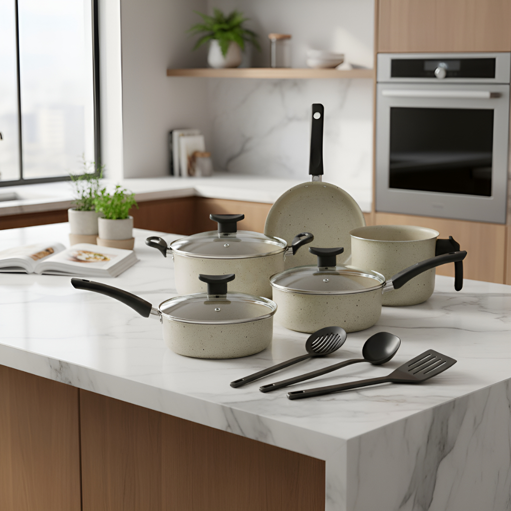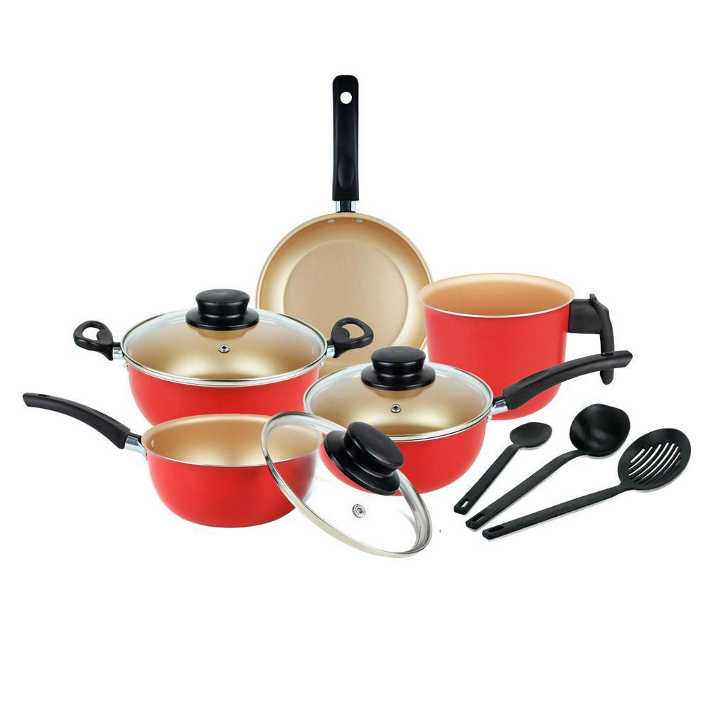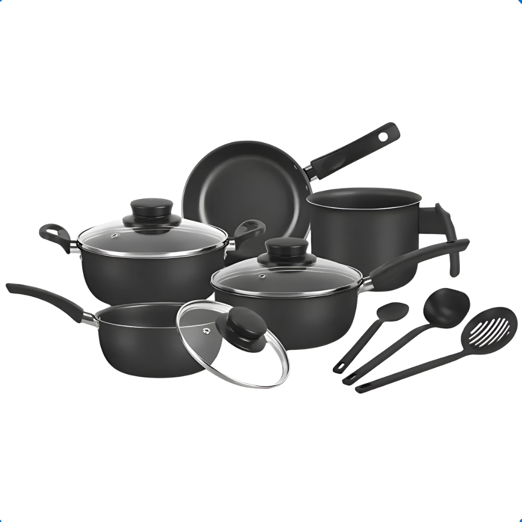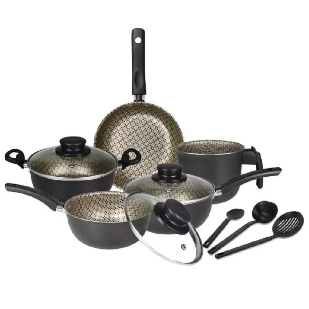 Jogo de Panelas 8 Peças Antiaderente Dona Chefa Tampa de Vidro, Com Utensílios, Cores Variadas