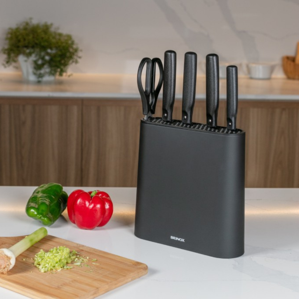 Jogo de Facas 6 Peças com Suporte Aço Inoxidável e ABS na cor Preto - Linha Action Brinox