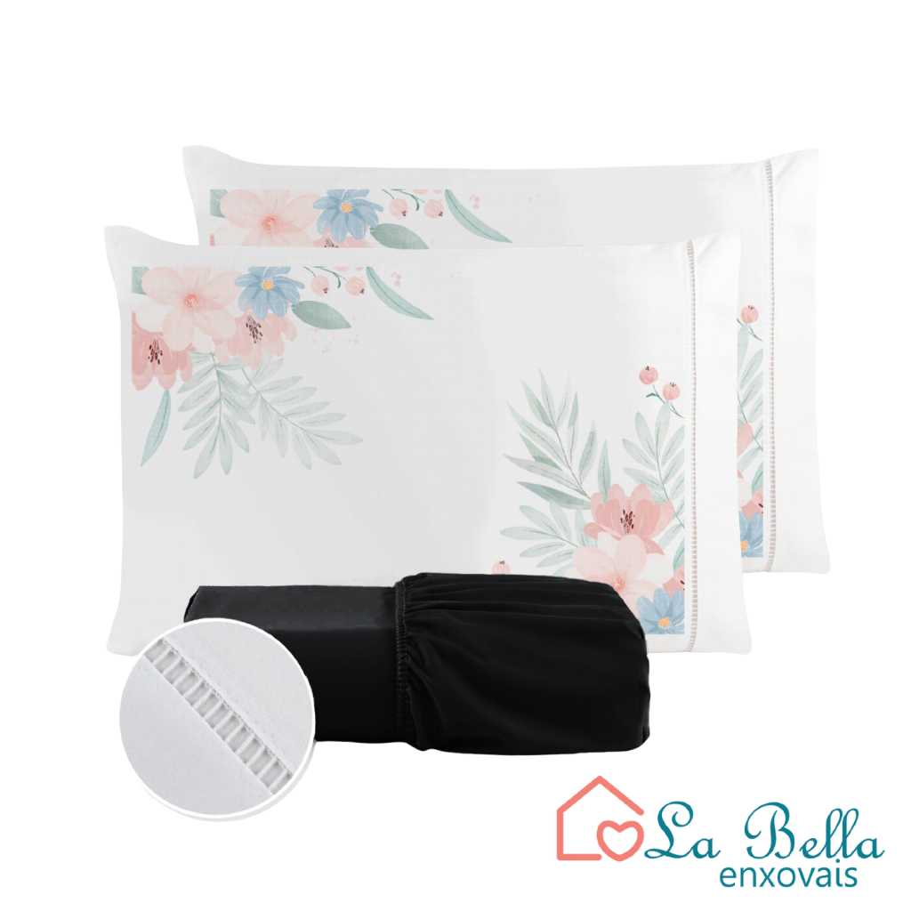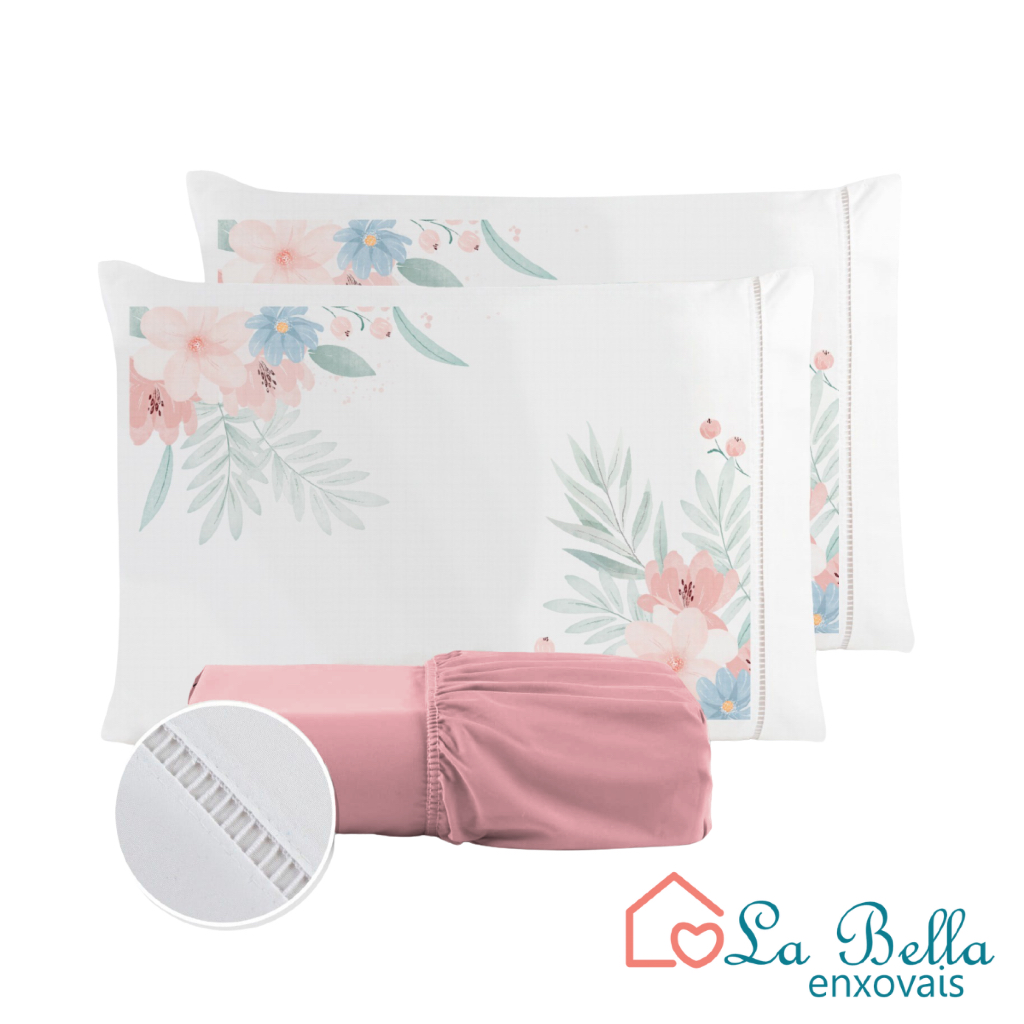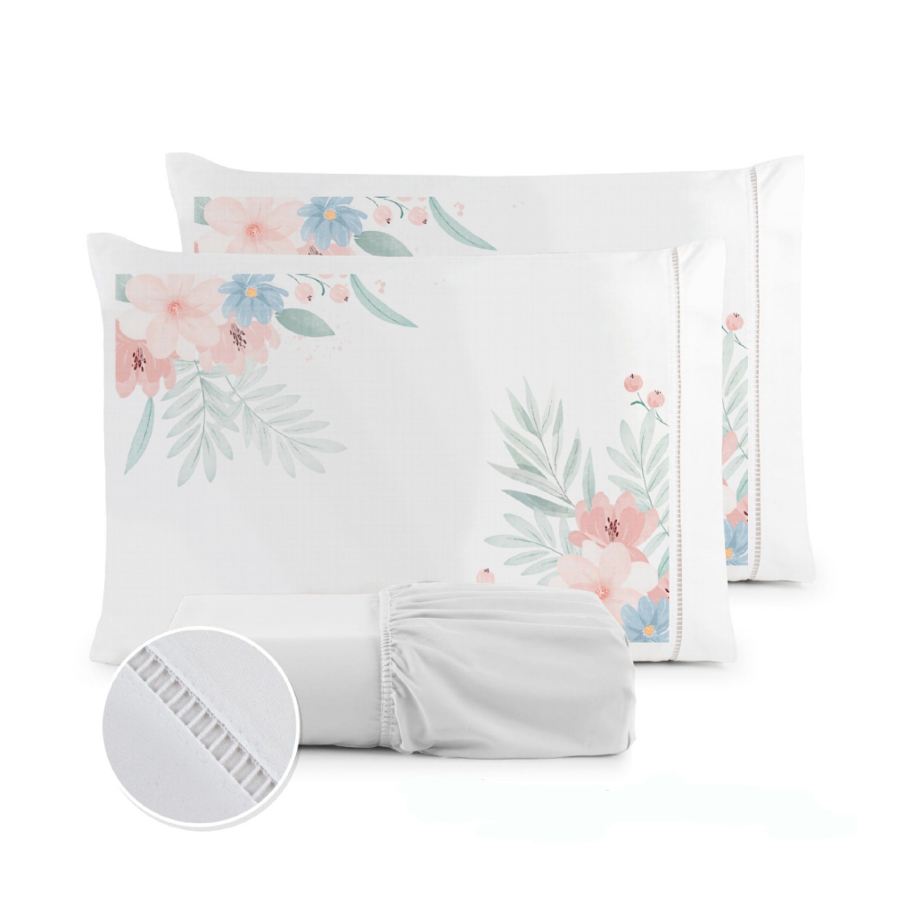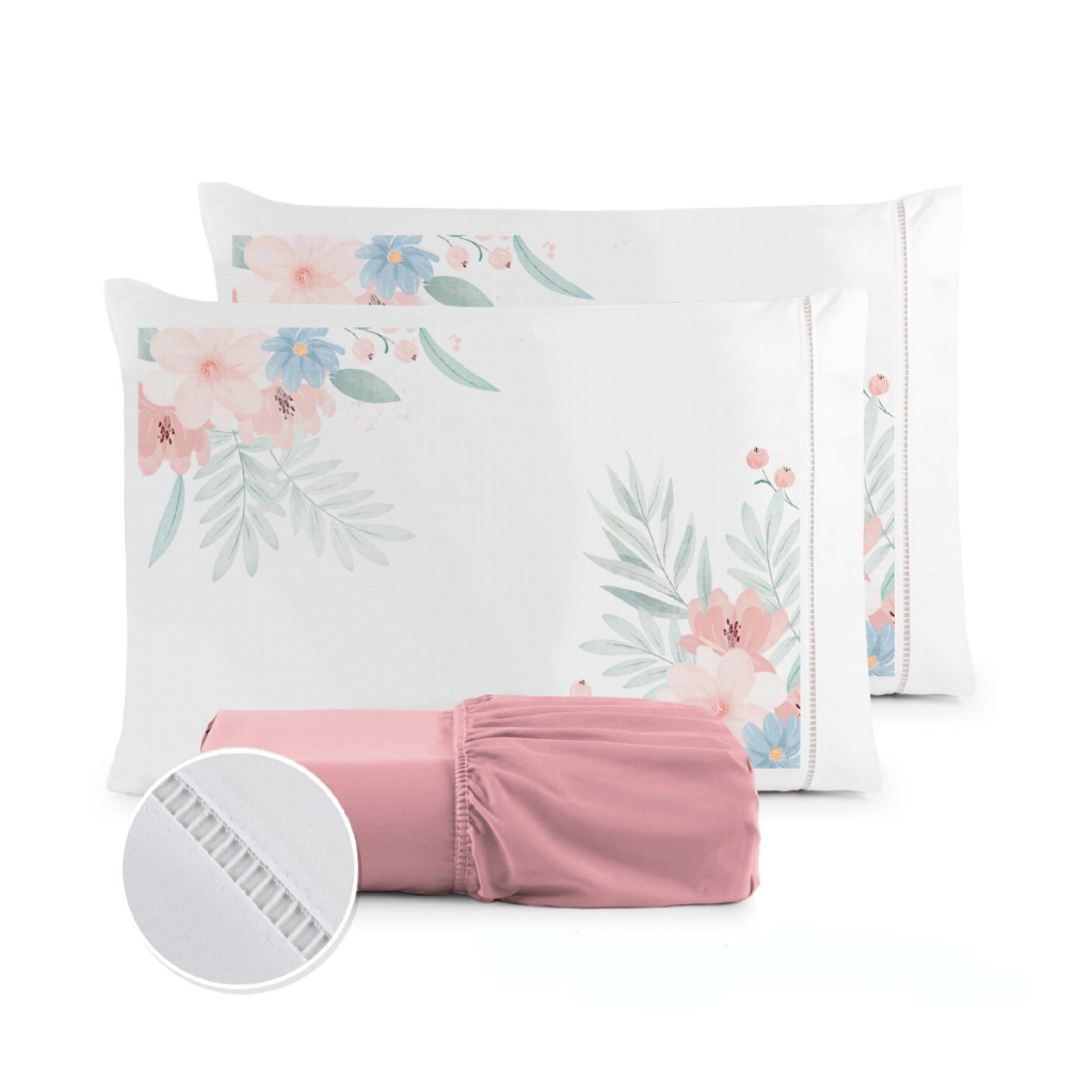 Jogo de Lençol Fronha Flor Rosa Estampada Micropercal 400 Fios Ponto Palito - ÚLTIMO LANÇAMENTO