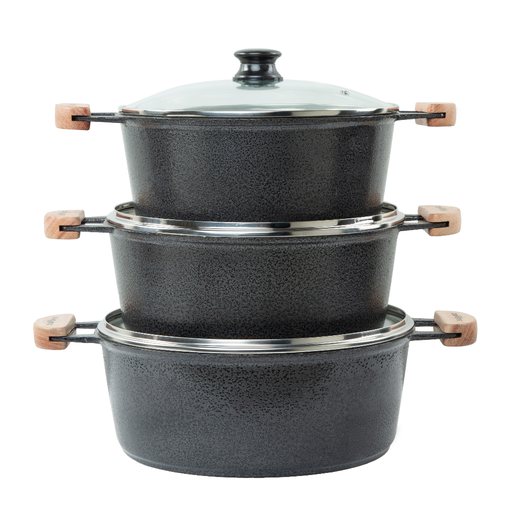 Jogo de Panela Caçarola Aluminio Fundido Grosso Craqueado Preto 3 peças 26 a 30 com tampa de vidro