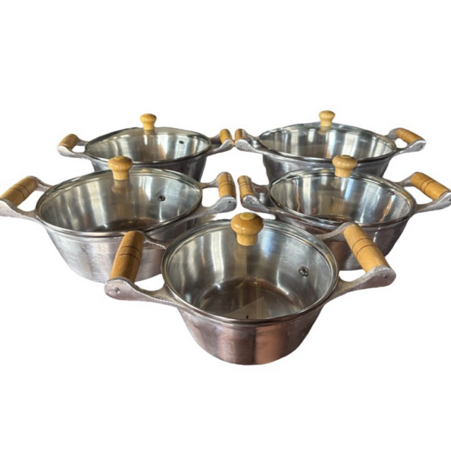 Jogo de Panela Cacarola Alumínio Batido Grosso Com Tampa De Vidro 5 pecas 16 a 24 cm Polida