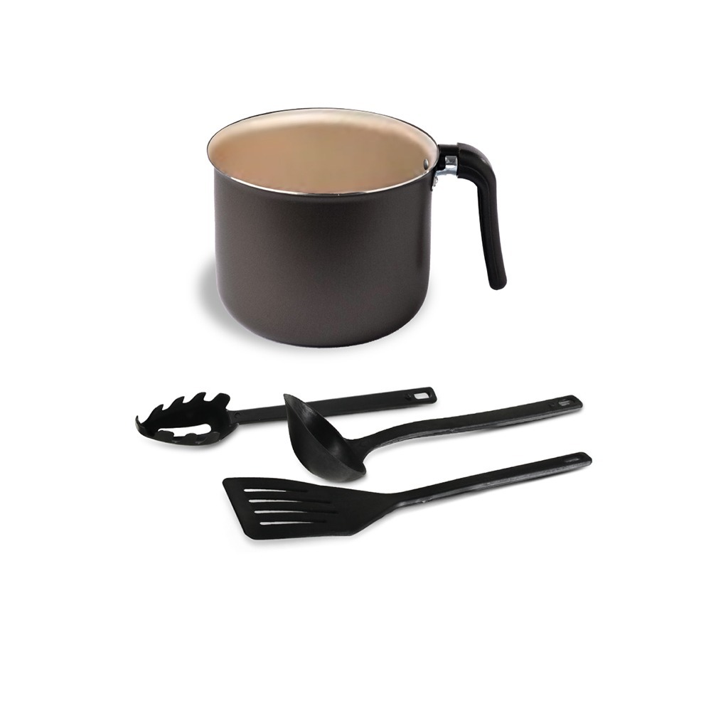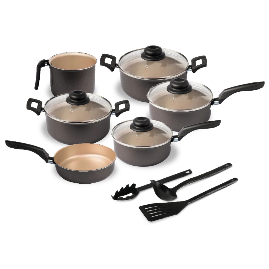 Jogo de Panelas 09 Peças Antiaderente c/ Tampa de Vidro + Utensílios