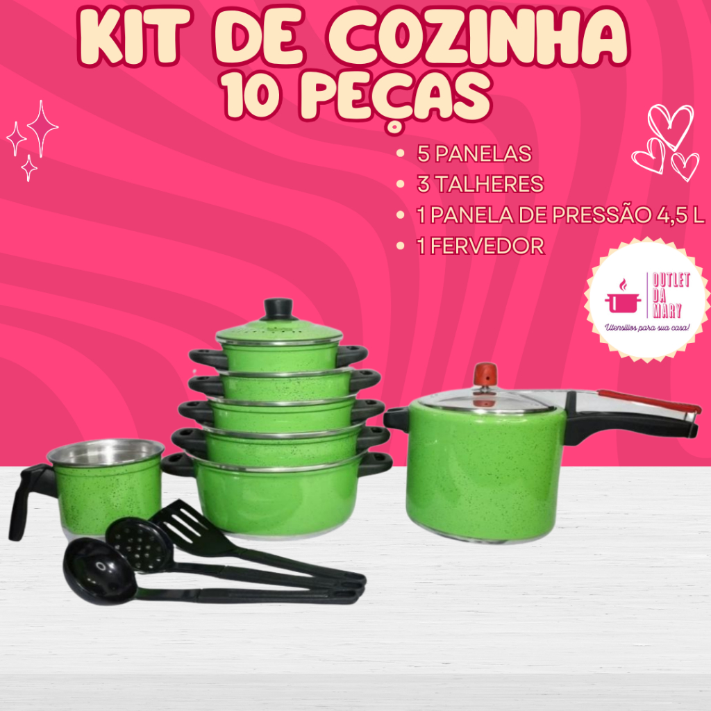 Jogo de Panelas 5 Peças Verde + Panela de Pressão 4,5 Litros + 3 Talheres + Fervedor 12 cm