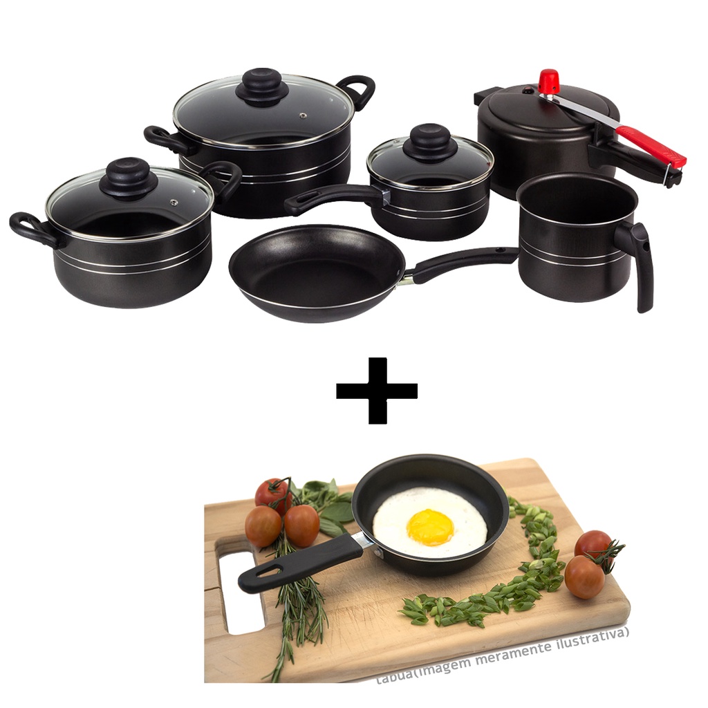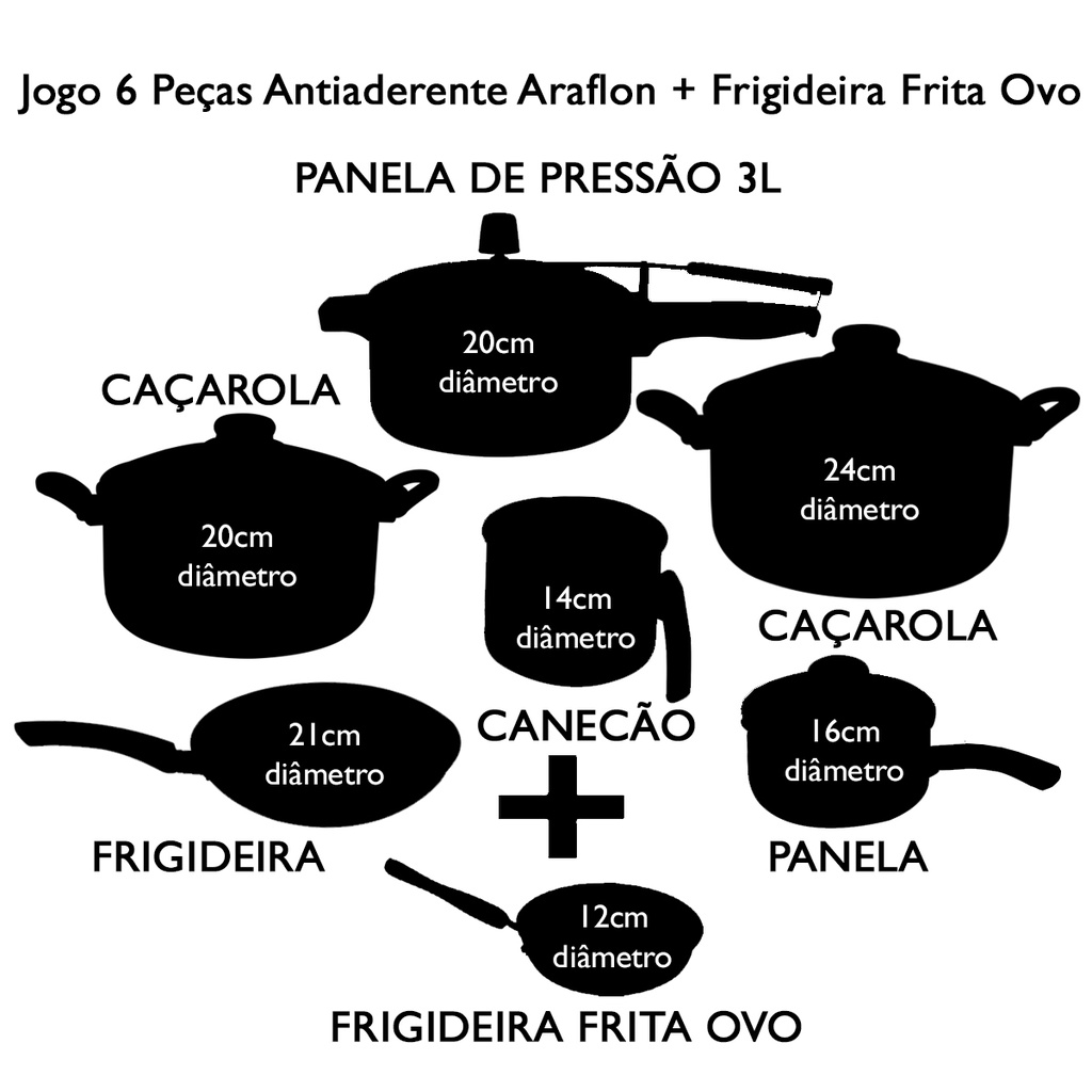 Jogo de Panelas 6 Peças Antiaderente Araflon com Panela de Pressão 3,0 Litros + Frigideira Frita Ovo