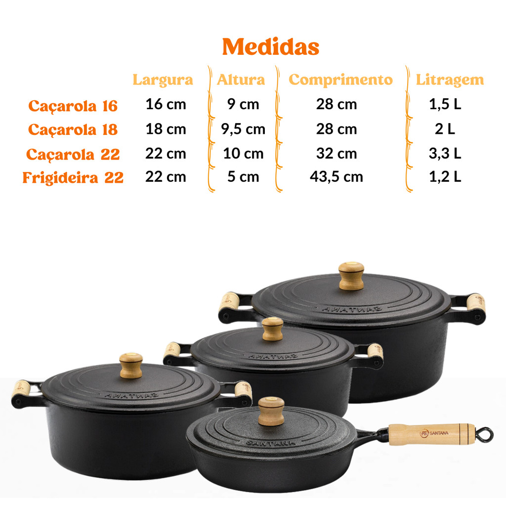 Jogo de caçarolas 16, 18, 22 tampa de ferro alça de madeira e frigideira 22 Com tampa