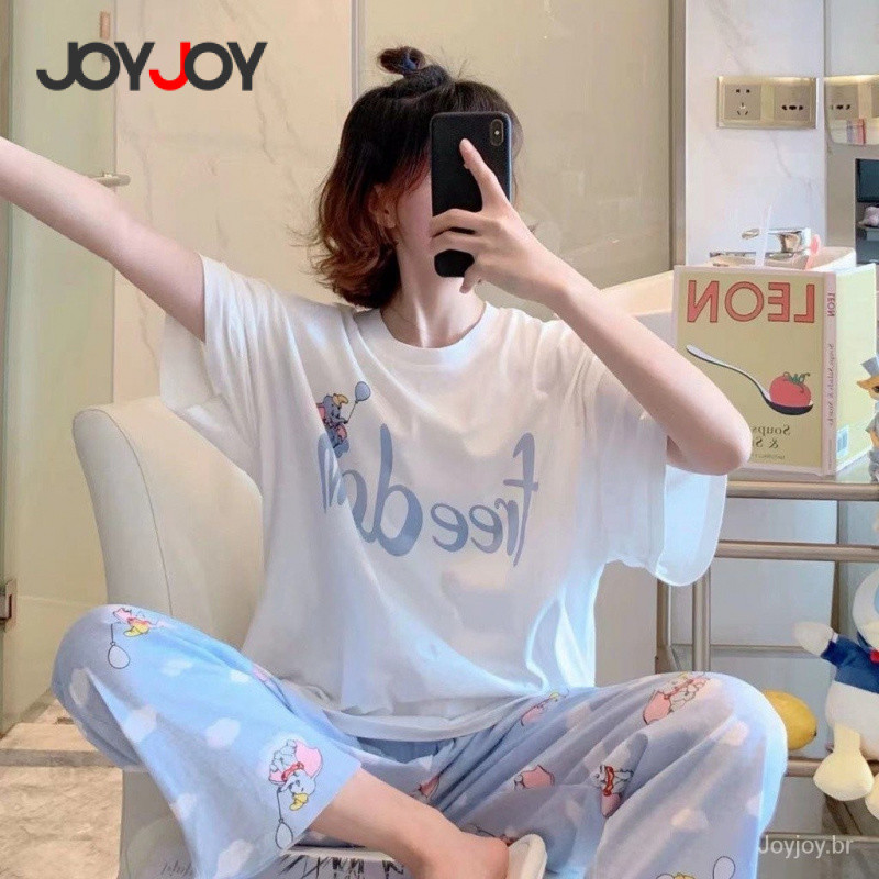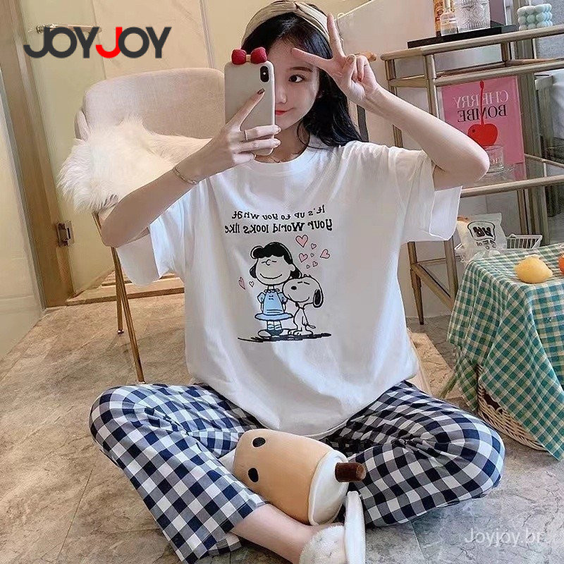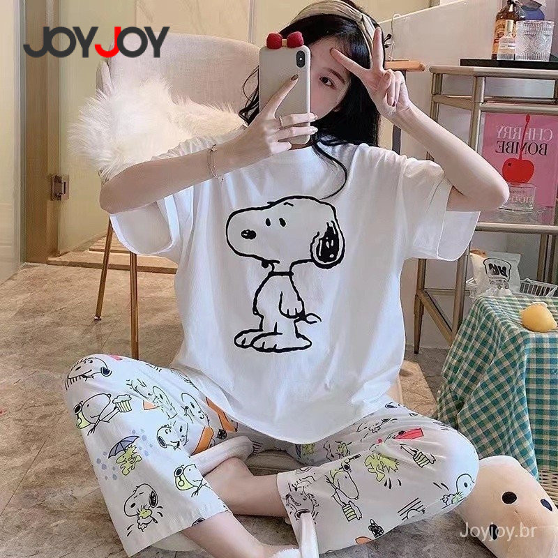 Joyjoy Conjunto Pijama Feminino Verão Fofo de Manga Curta com Calça Tamanho Grande – Desenho Animado Hello Kitty Snoopy