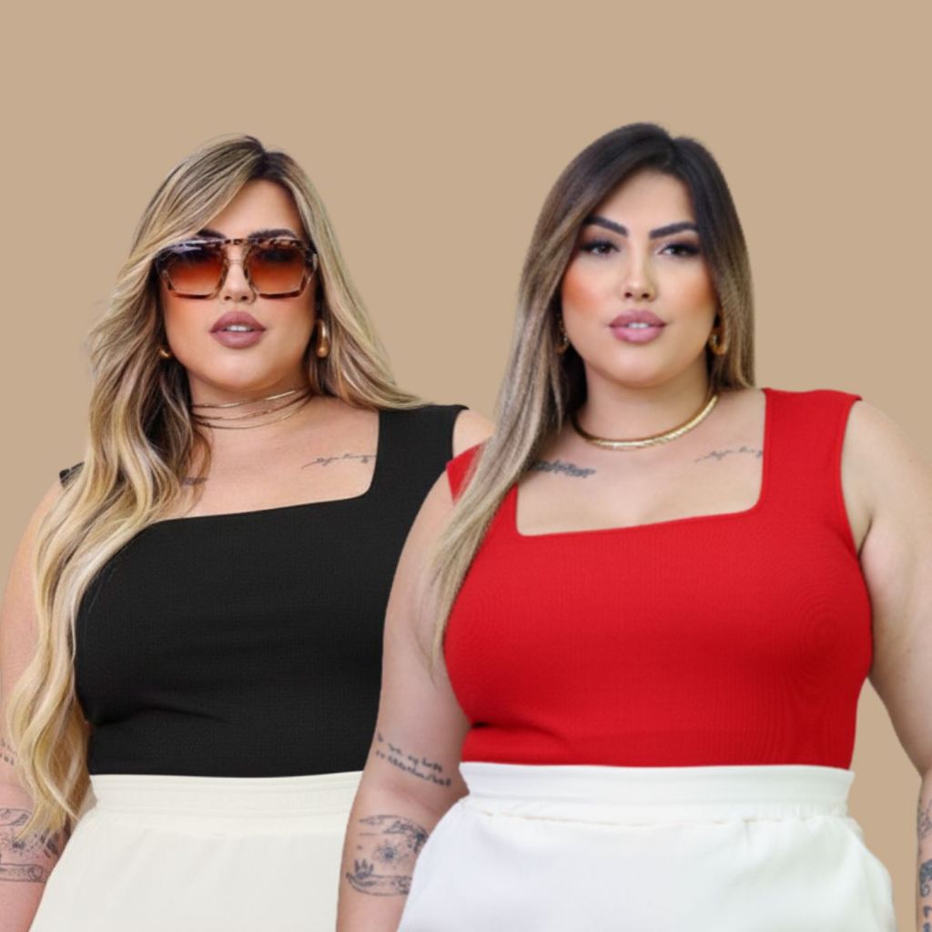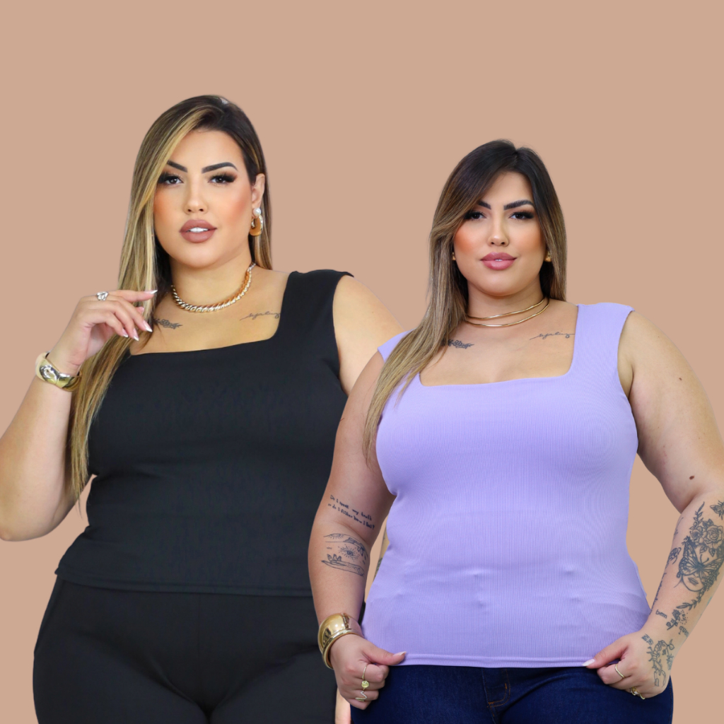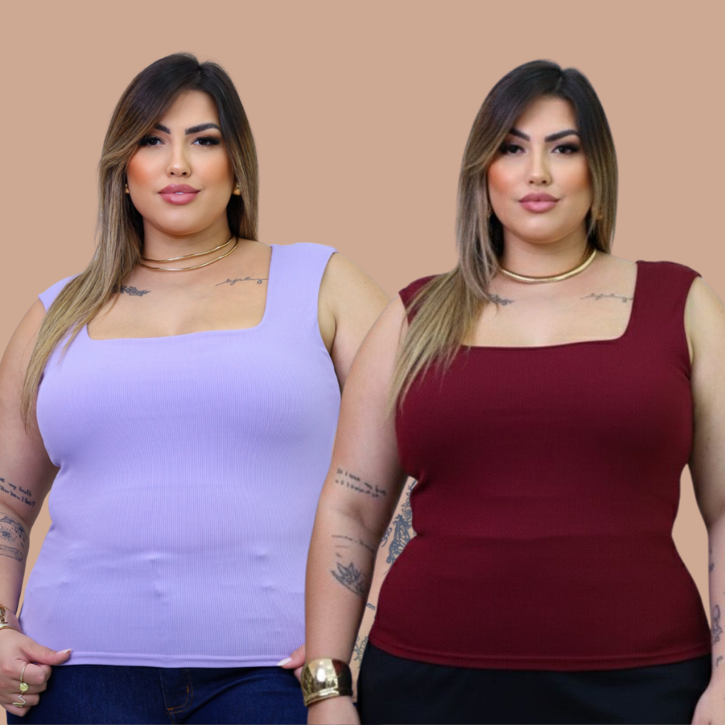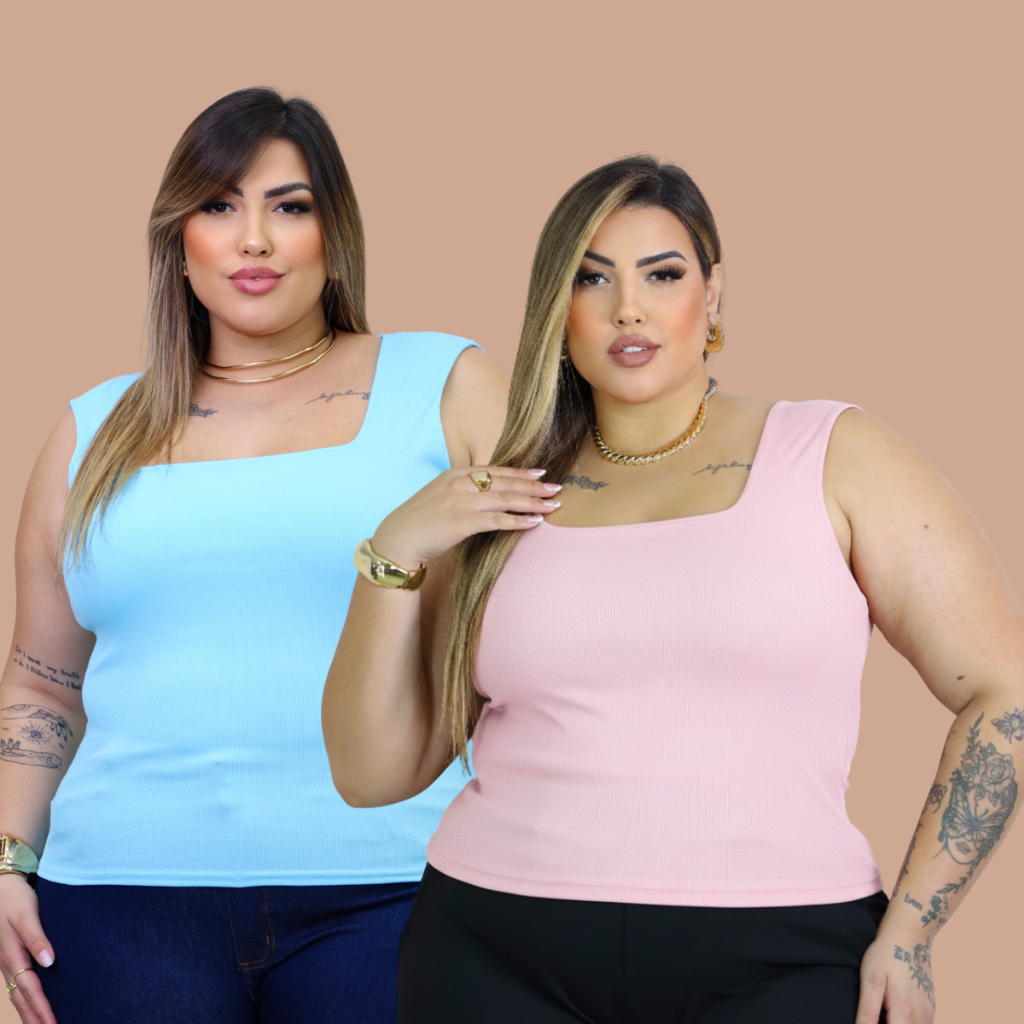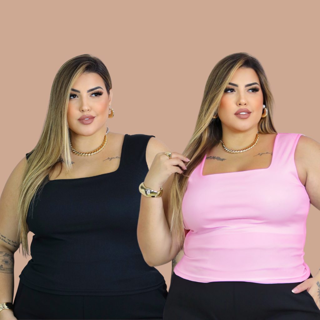 KIT 2 Blusa Regata Plus Size Social Chique com Gola Quadrada Verão Moda Feminina Plus Size Elegante