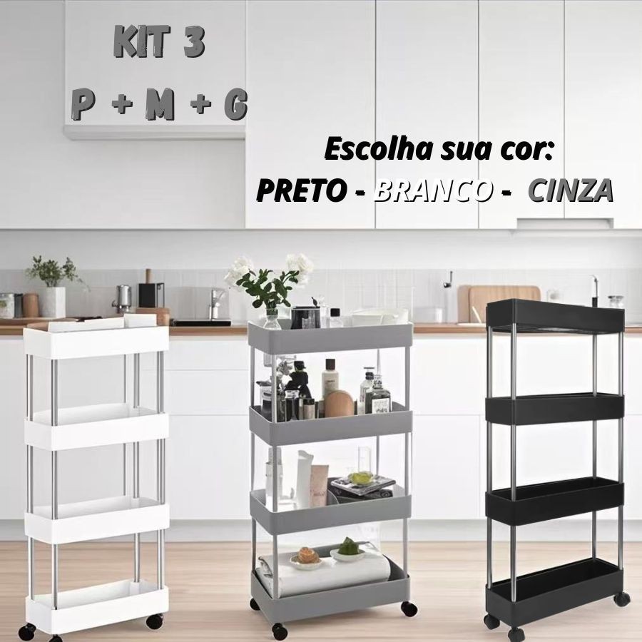 KIT 3 Carrinhos com 4 Prateleiras Portátil com Rodinhas Pequeno Médio Grande