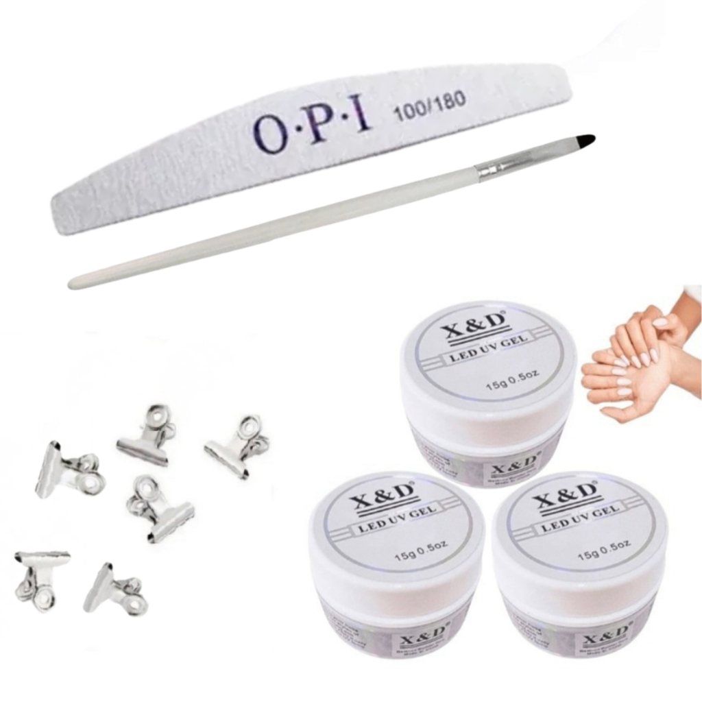 KIT 3 Gel 15g X&D Original C/Anvisa + 6 Presilhas + Lixa Boomerang + Pincel Para Unha Gel Fibra