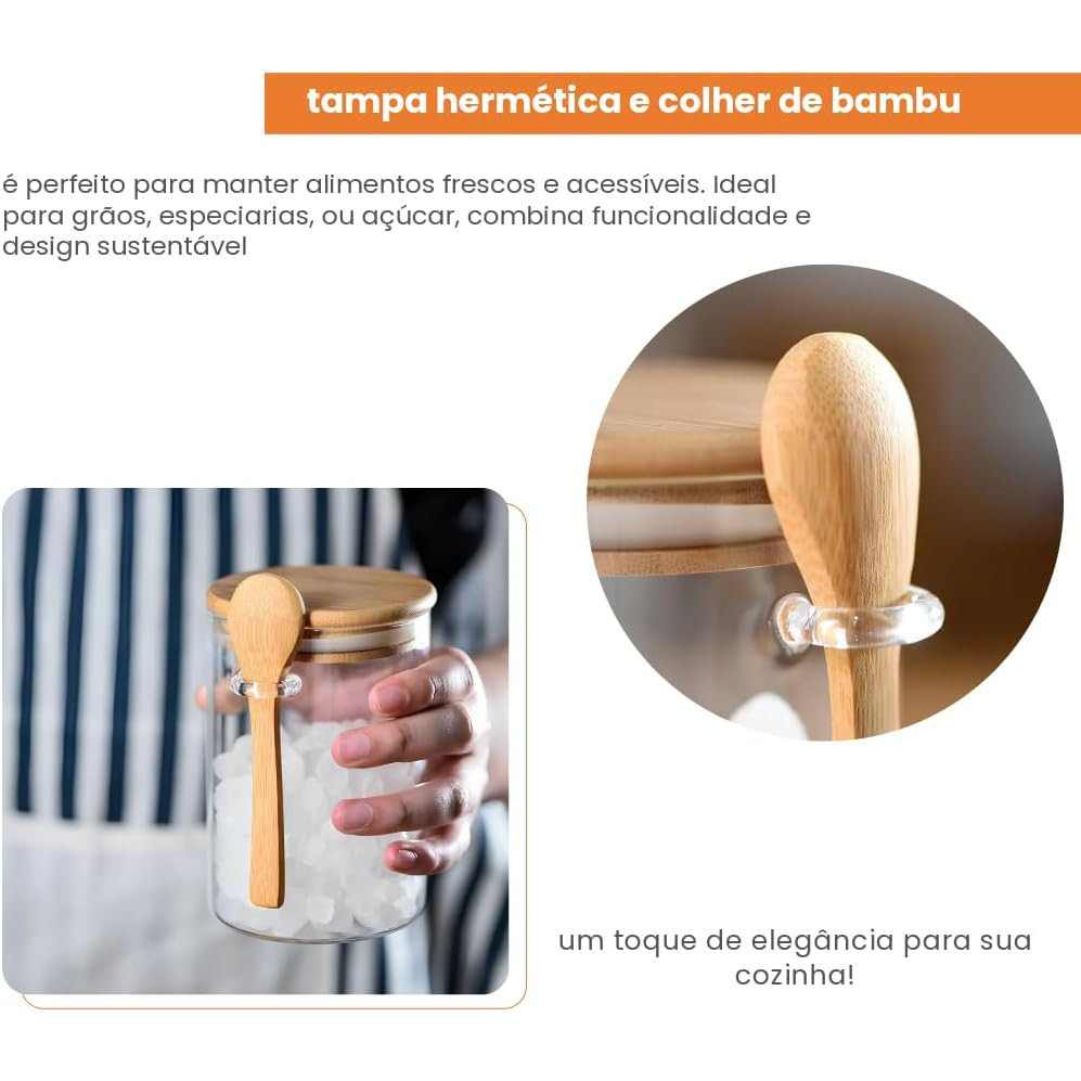 KIT 3 Pote De Vidro Hermético Com Tampa E Colher De Bambu Redondo Organizador Multiuso De Cozinha