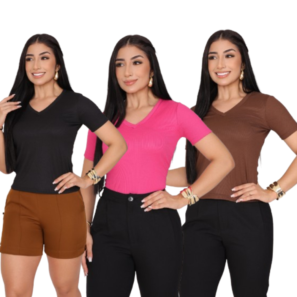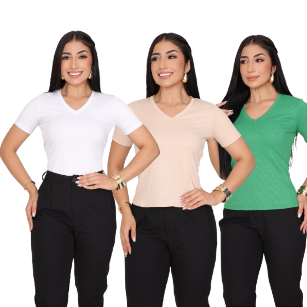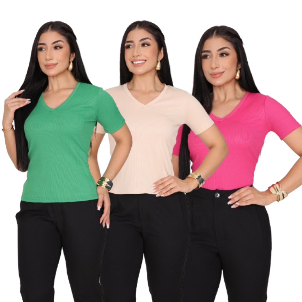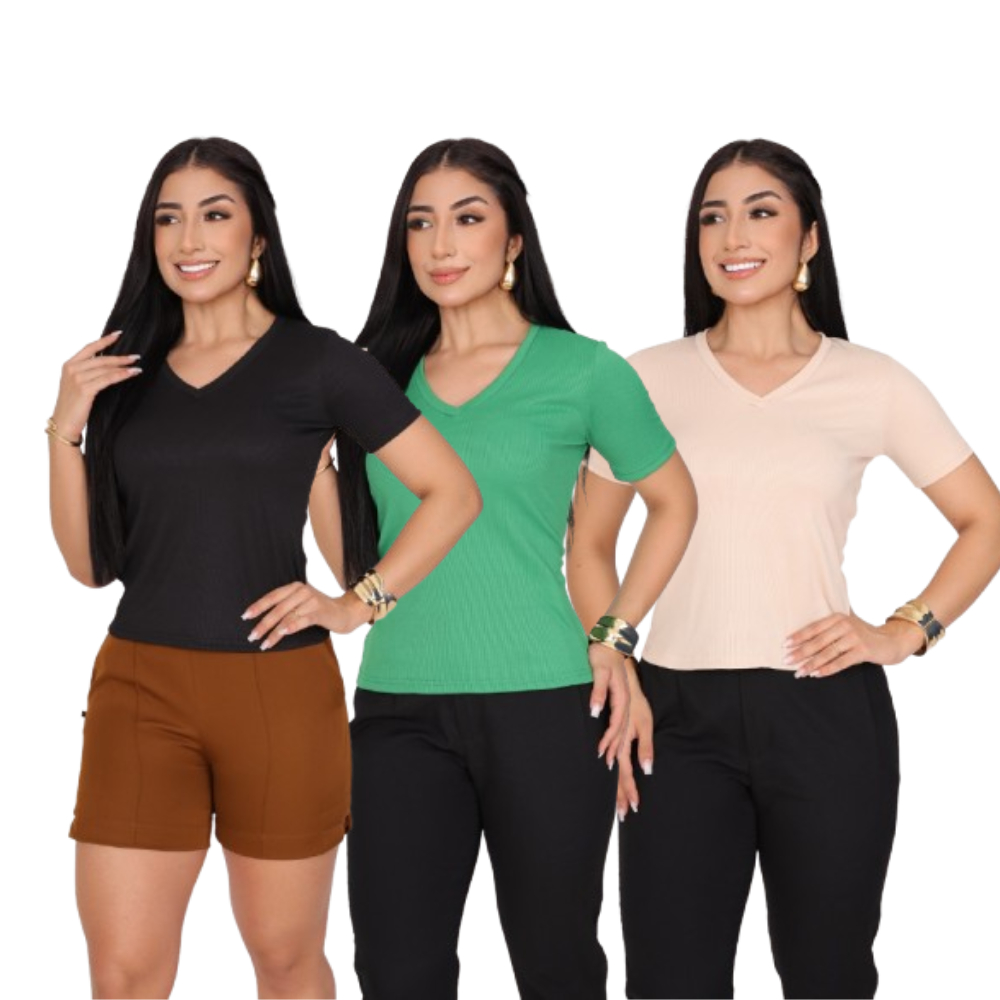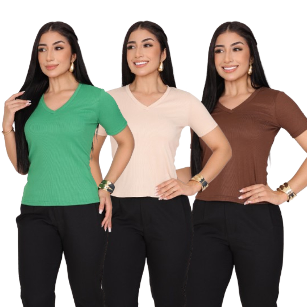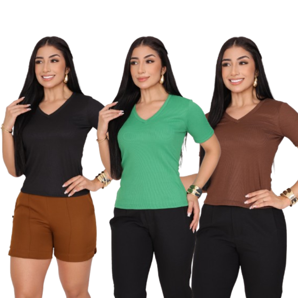 KIT 3 T-SHIRT GOLA V CANELADO COM MANGA FEMININO BLUSA COM DECOTE
