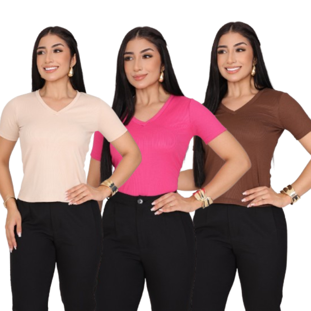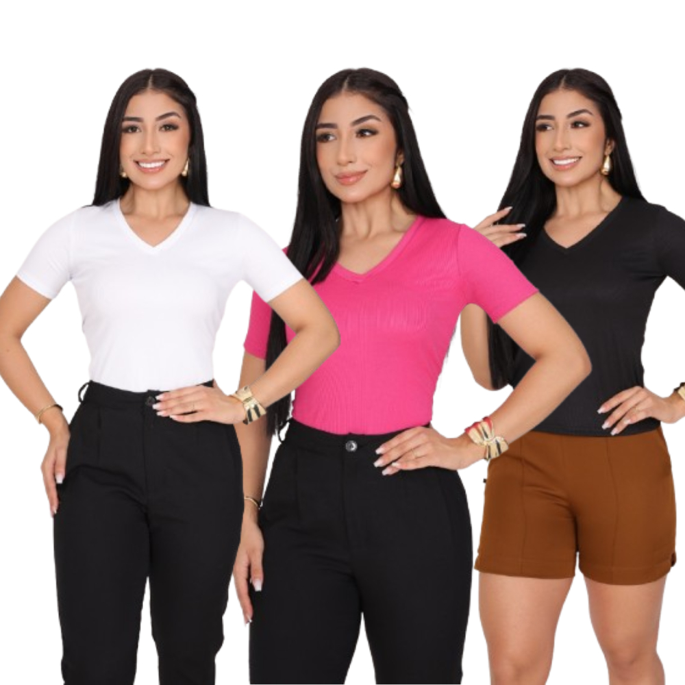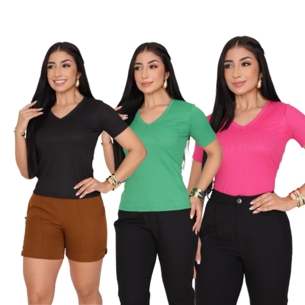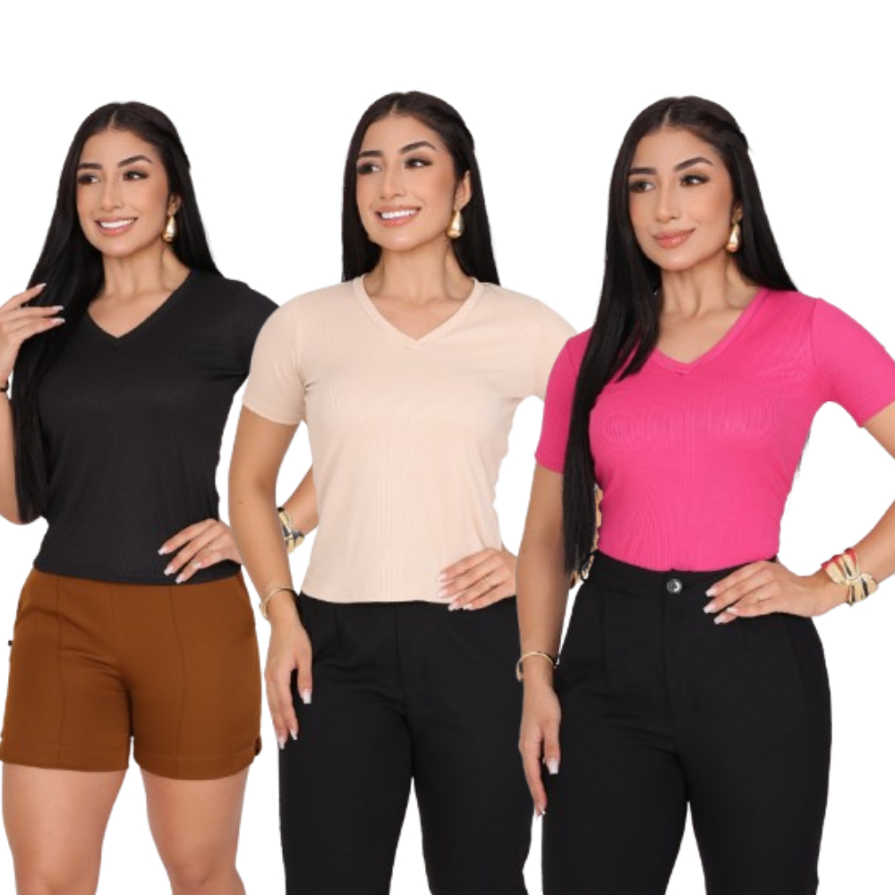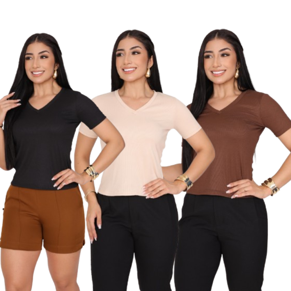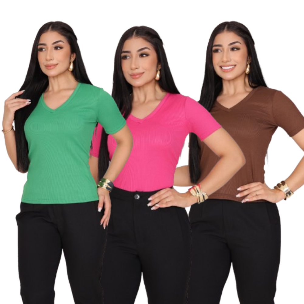 KIT 3 T-SHIRT GOLA V CANELADO COM MANGA FEMININO BLUSA COM DECOTE