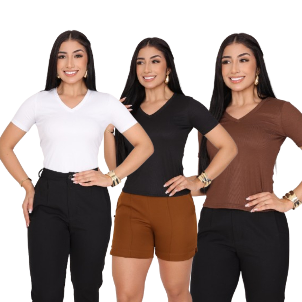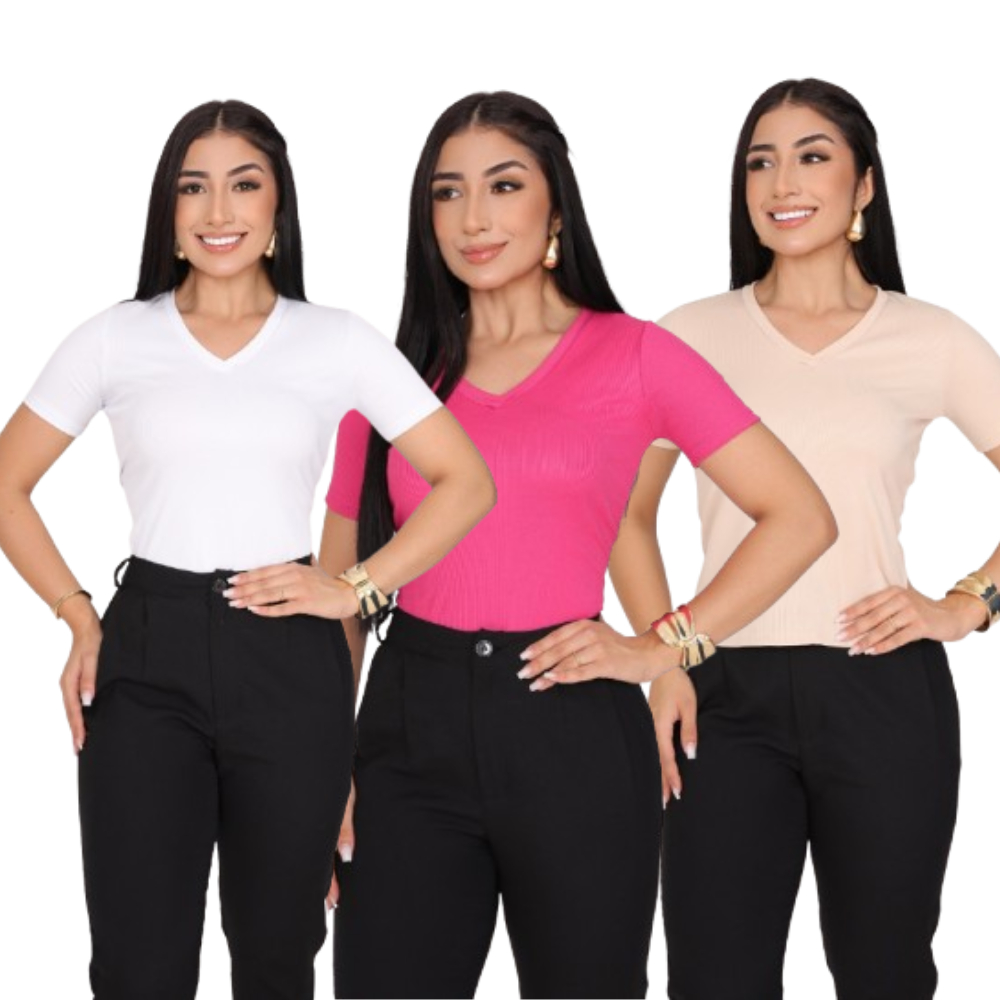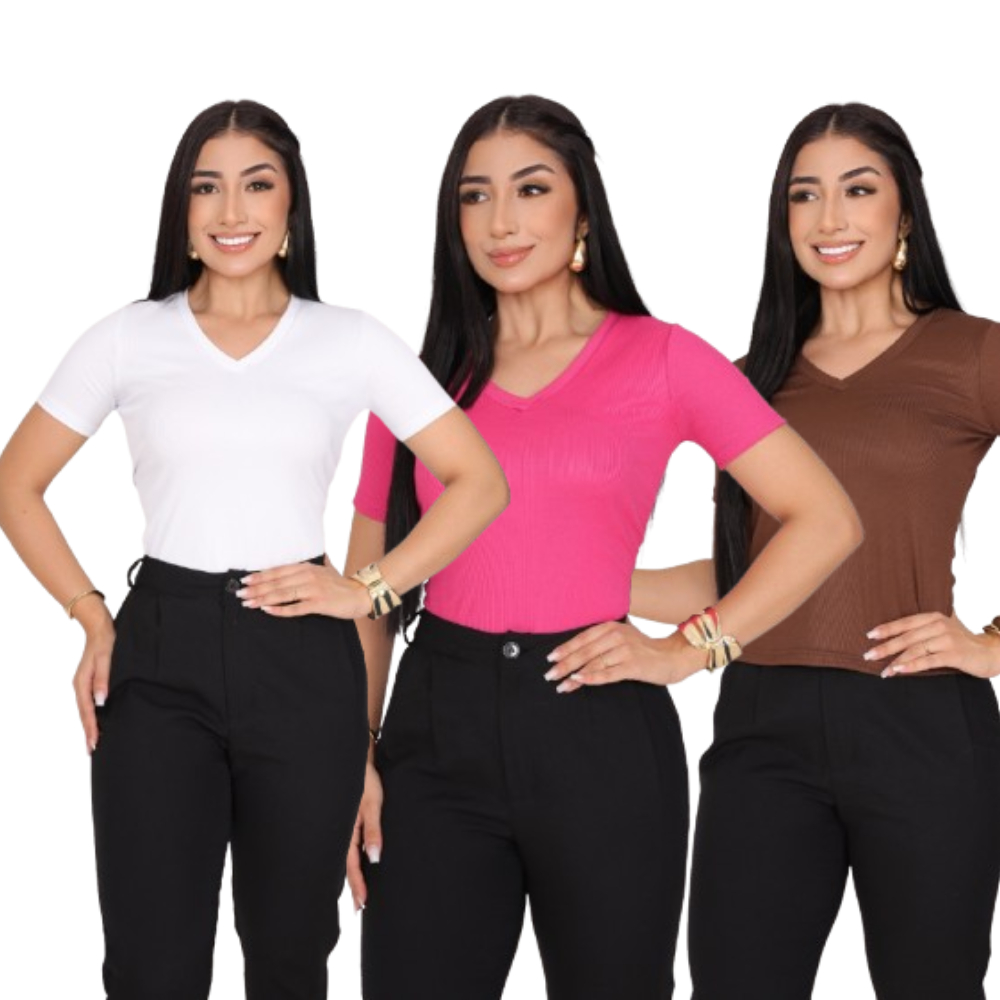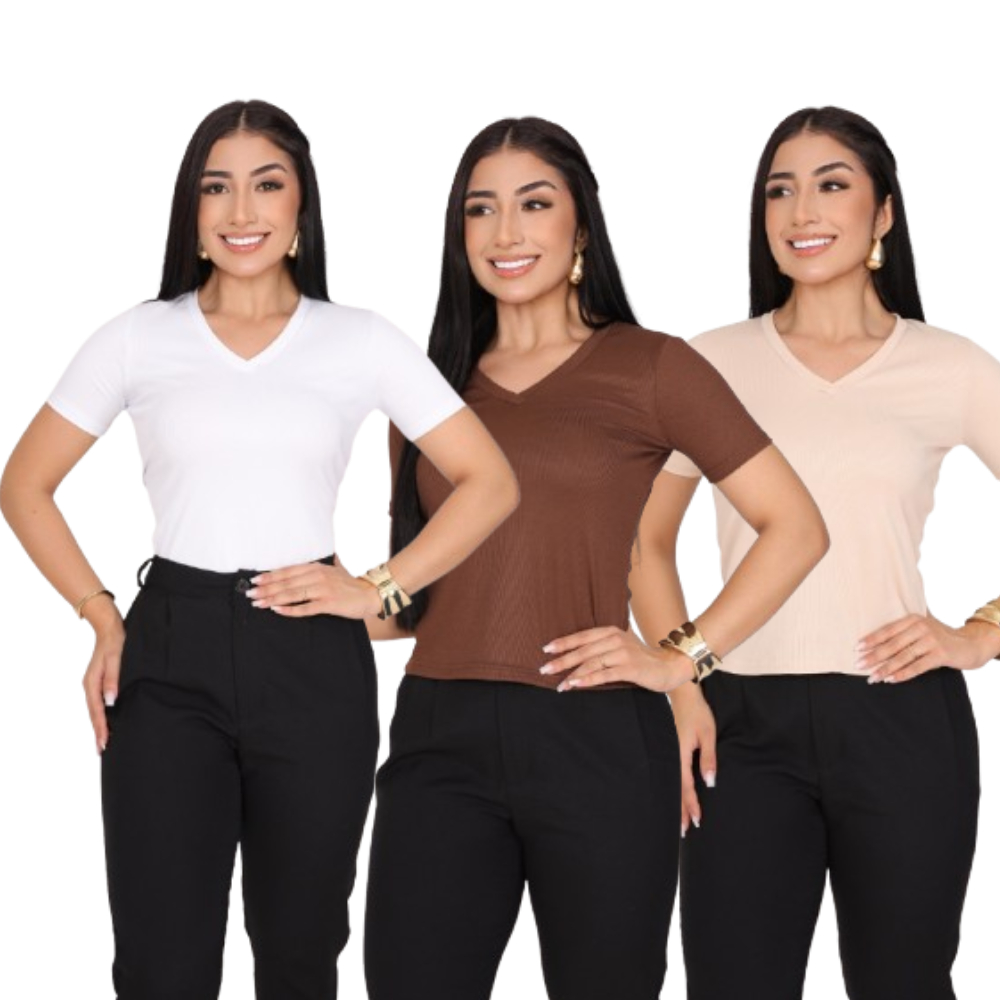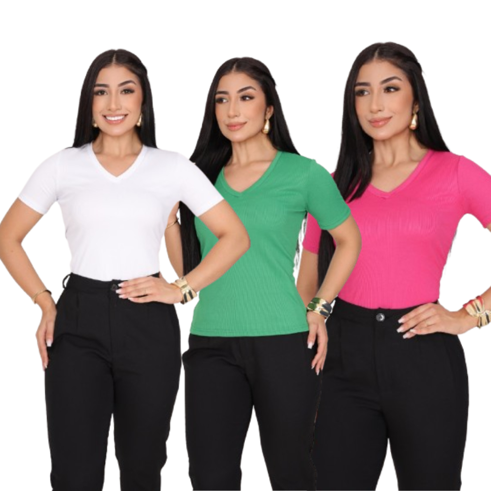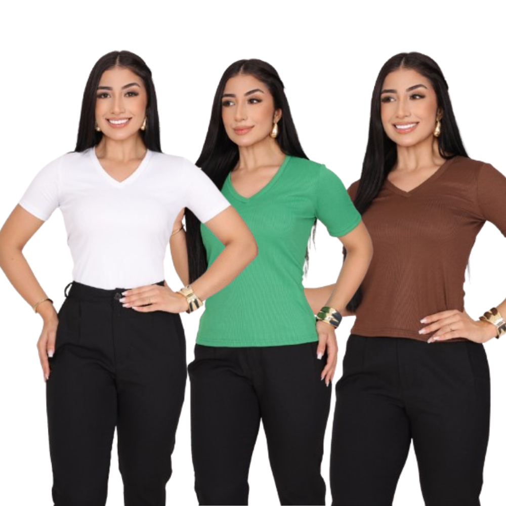 KIT 3 T-SHIRT GOLA V CANELADO COM MANGA FEMININO BLUSA COM DECOTE