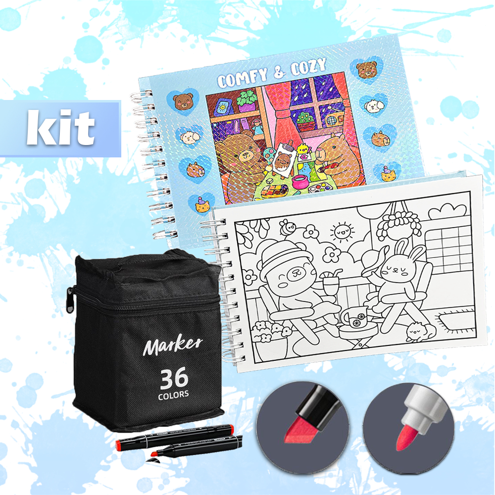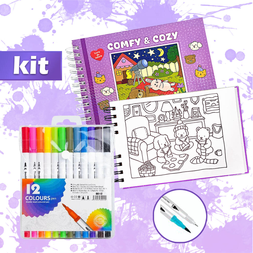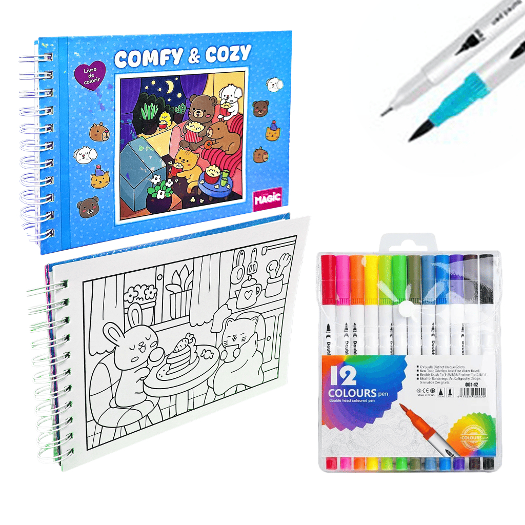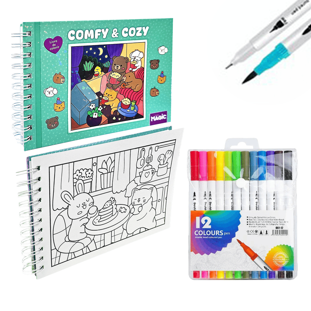 KIT Caderno de Pintura Comfy & Cozy 50 Folhas + Canetas Marcadoras TOUCH de Ponta Dupla 12-80un