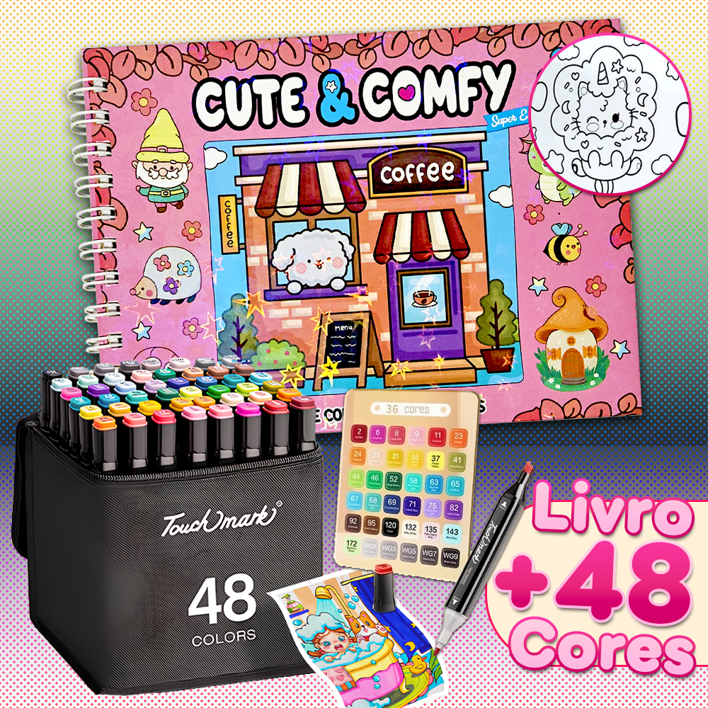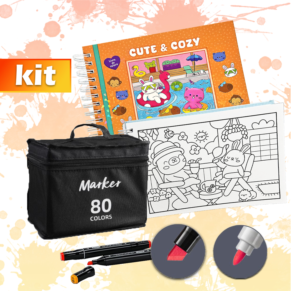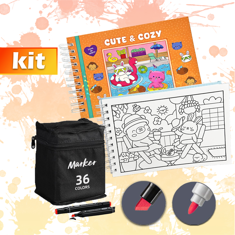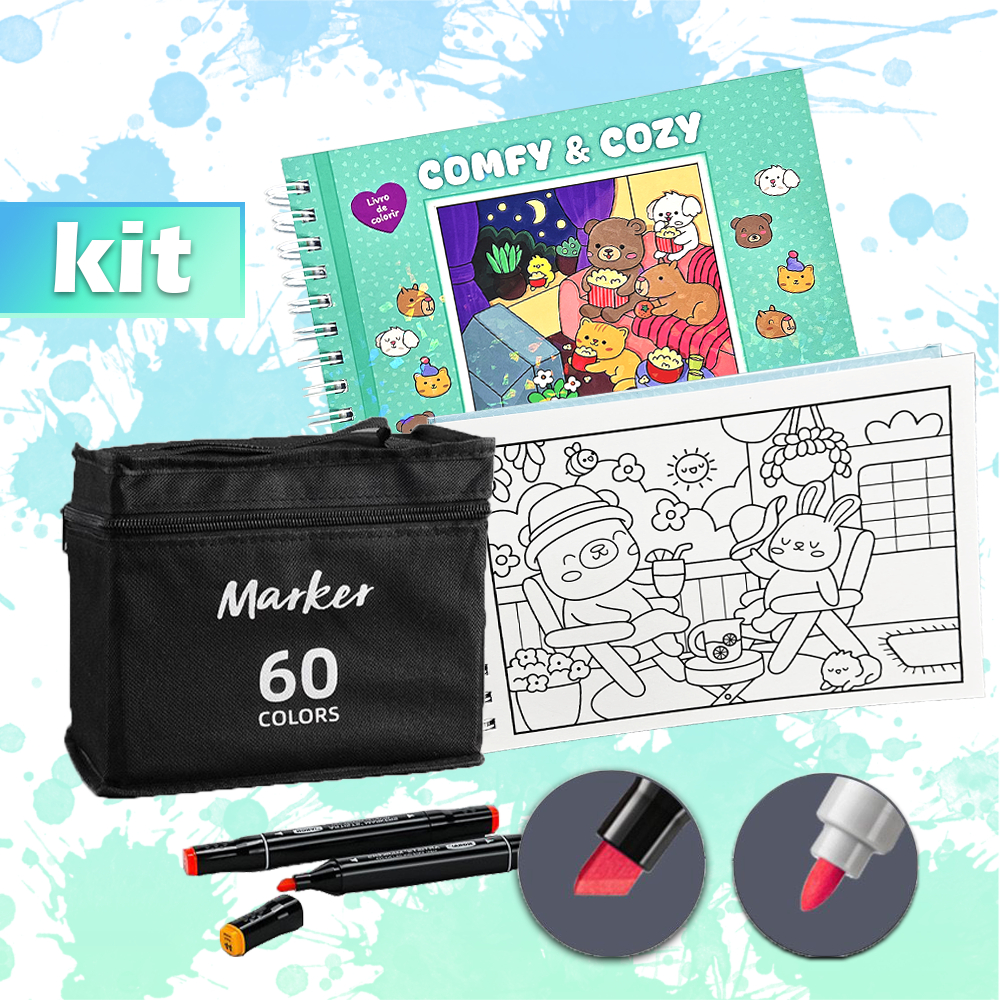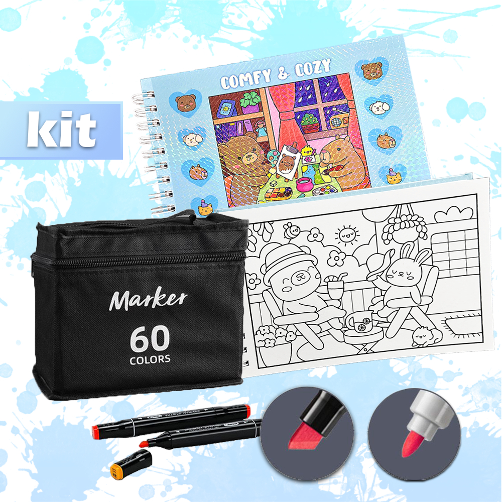 KIT Caderno de Pintura Comfy & Cozy 50 Folhas + Canetas Marcadoras TOUCH de Ponta Dupla 12-80un