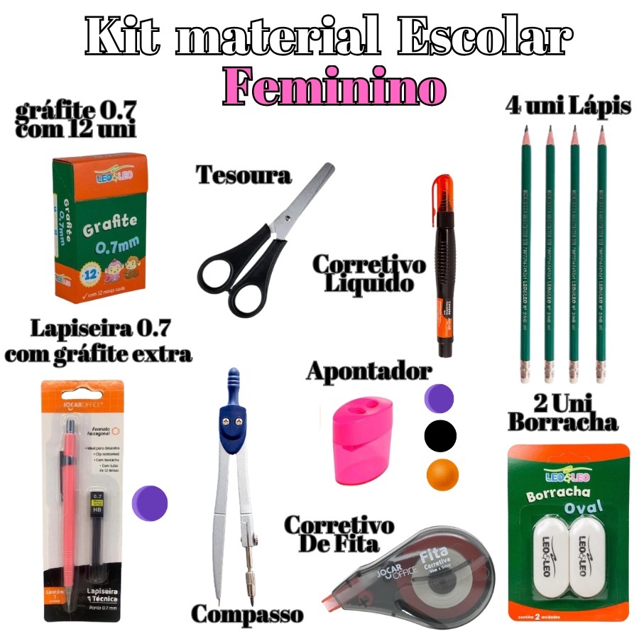 KIT Material Escolar De 4 Lápis 2 Borrachas Grafite Lapiseira 0.7 Corretivos E Apontador Compasso