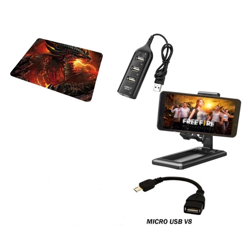 KIT PARA MOBILADOR HUB USB + SUPORTE + MOUSE PAD + ADAPTADOR OTG TIPO - C OU MICRO USB FREE FIRE FF PUBG COD MOBILE