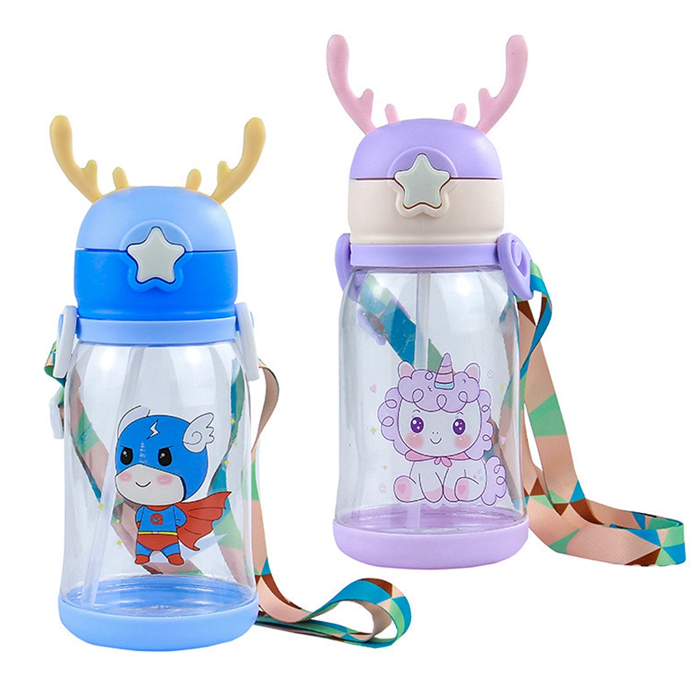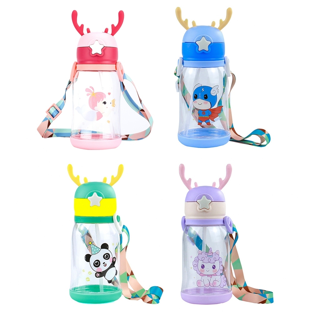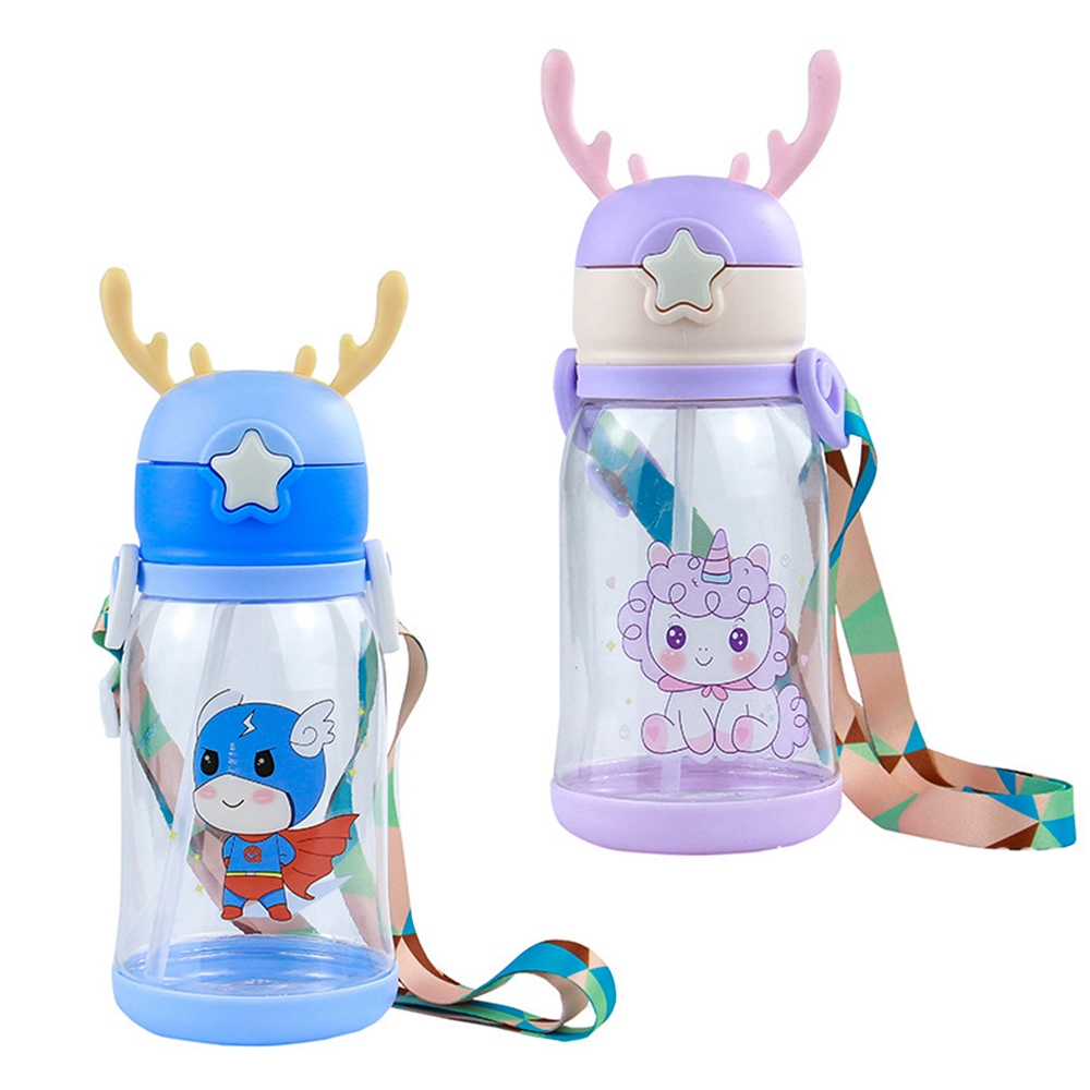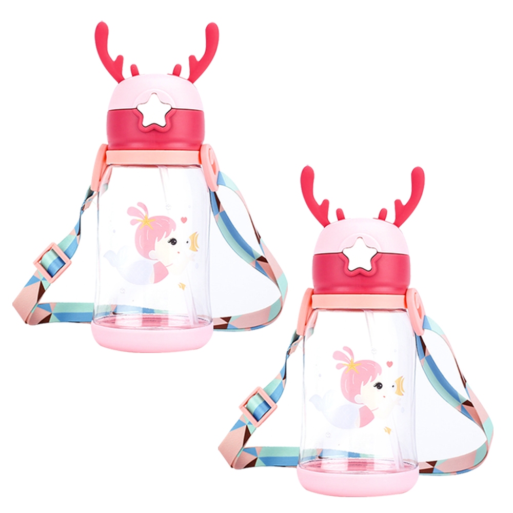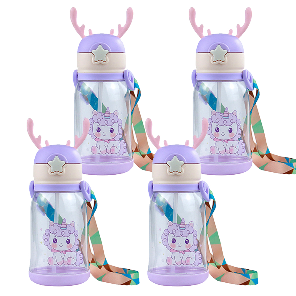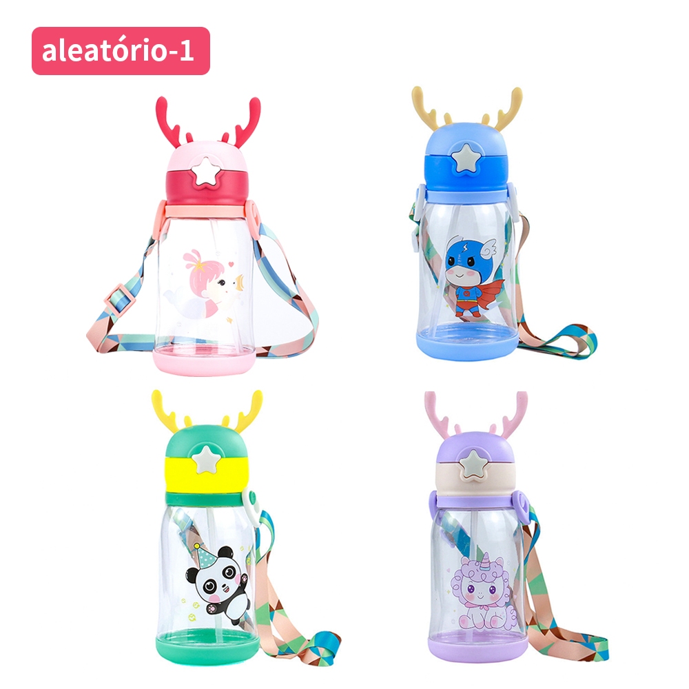 KIT2~KIT4 Garrafas De Alce Água Portáti Infantil 600ml Com Canudo e Cordão Copos Desenho
