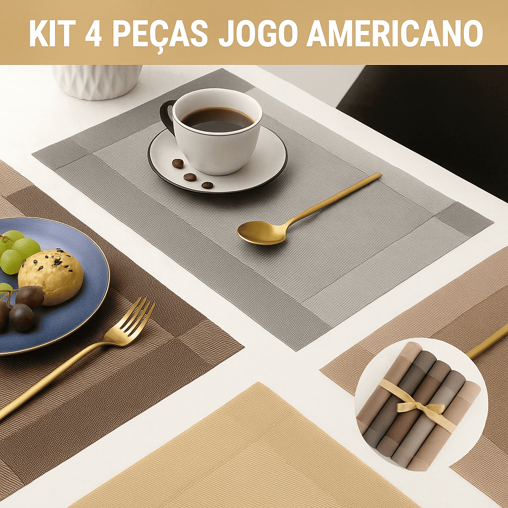 Kit 4 Jogos Americanos 45x30cm em PVC – Impermeável, Antiderrapante e Térmico, Ideal para Refeições com Estilo