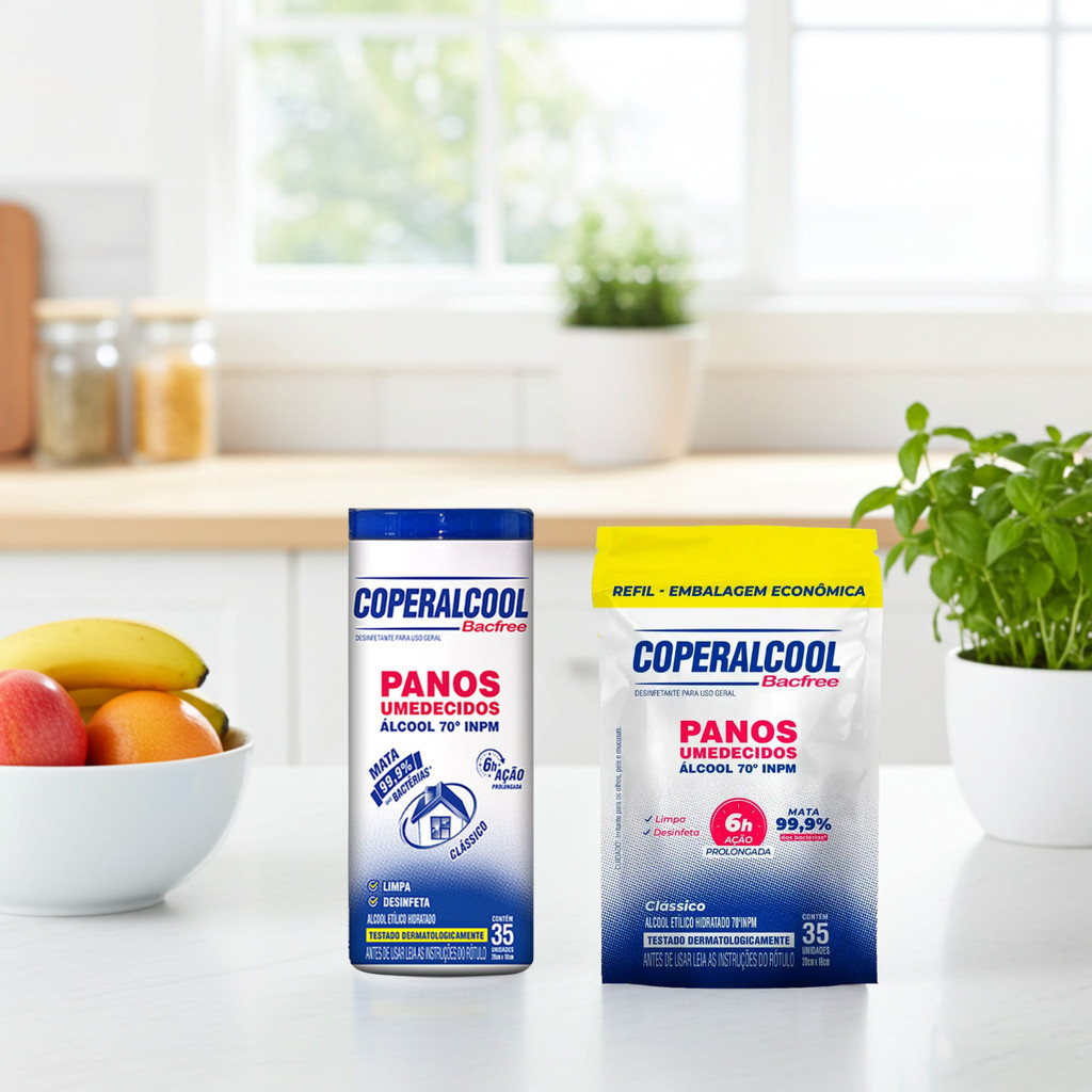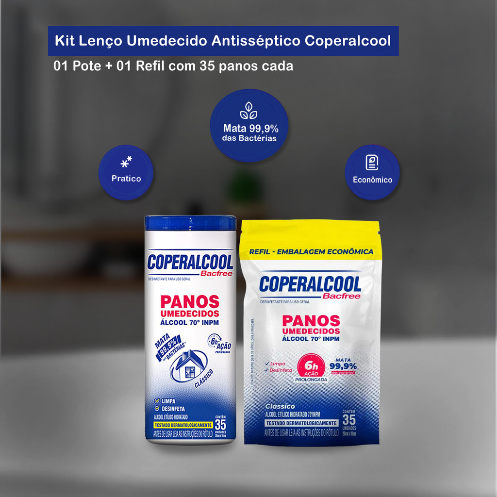 Kit 01 Pote + 01 Pacote Refil de Lenço Umedecido com Álcool 35 lenços cada Coperalcool