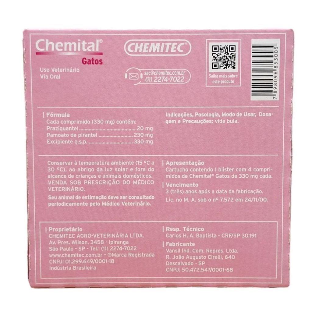 Kit 03 Vermífugo Chemital Chemitec Para Gatos com 4 Comp