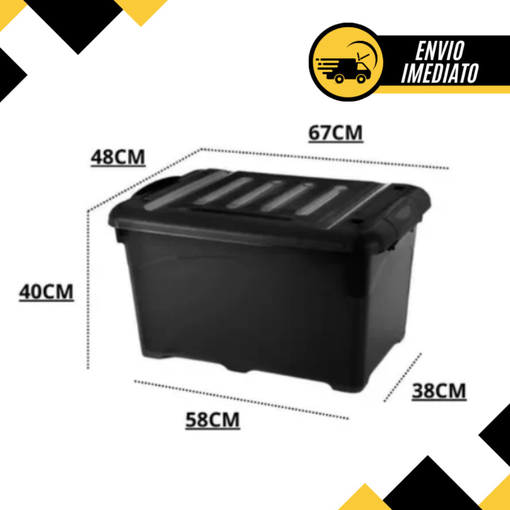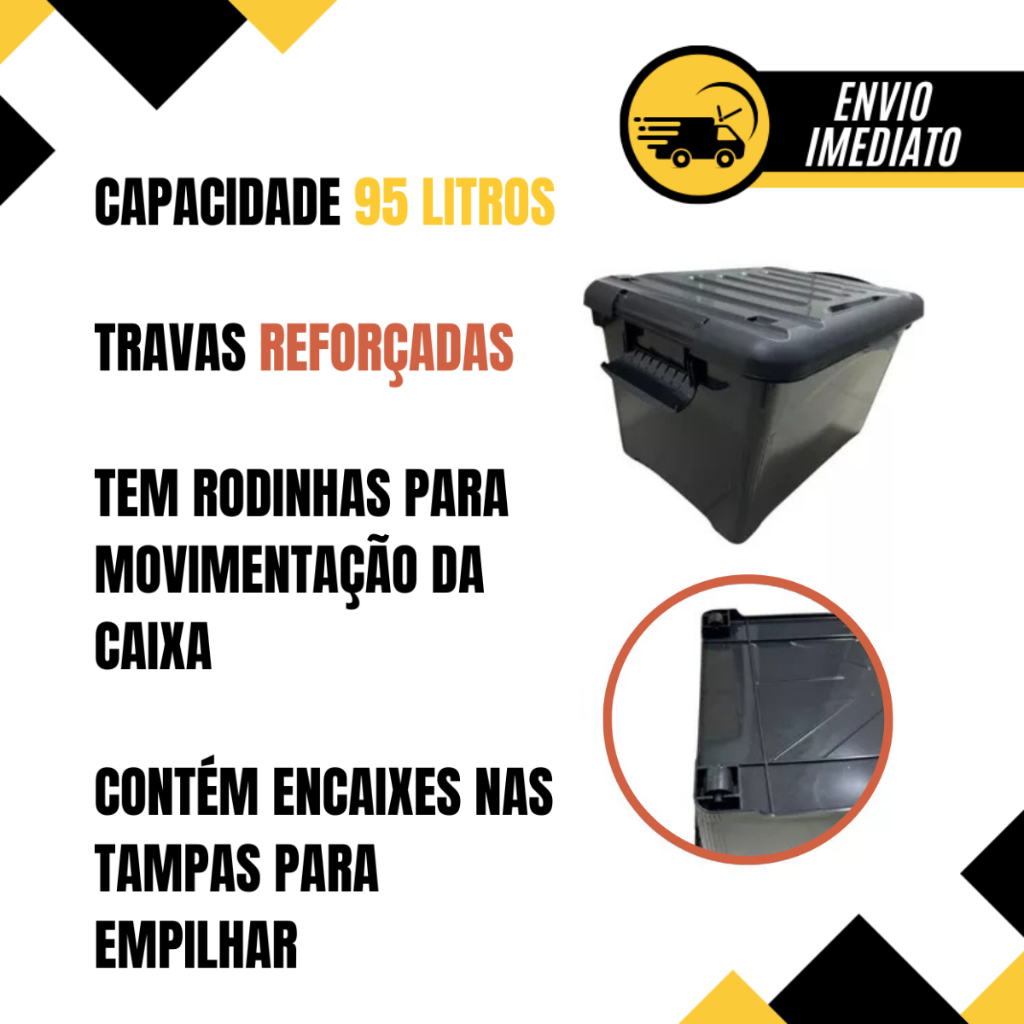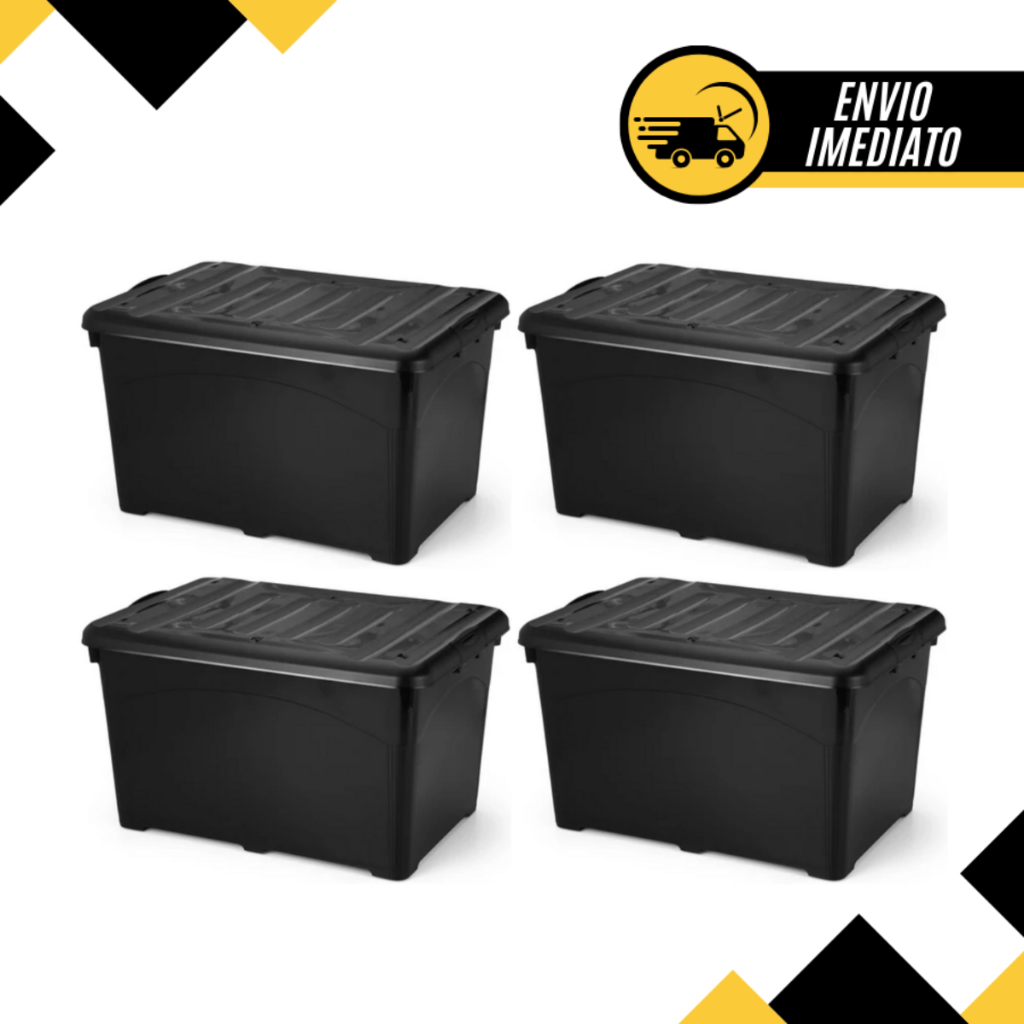 Kit 04 Caixa Organizadora 95 Litros Reforçada Com Trava Tampa e Rodinhas Empilhável Preta