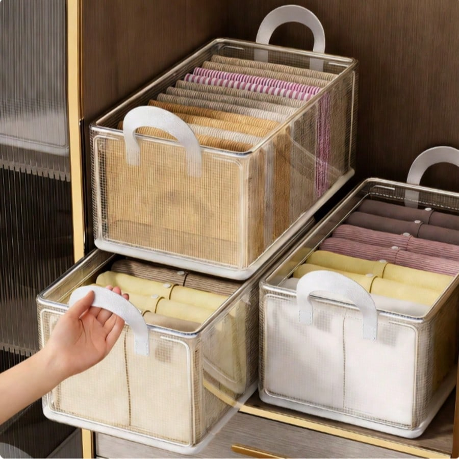 Kit 1/2/3 cestos organizadores de plástico transparente duráveis, com estrutura de aço e alças reforçadas, empilháveis