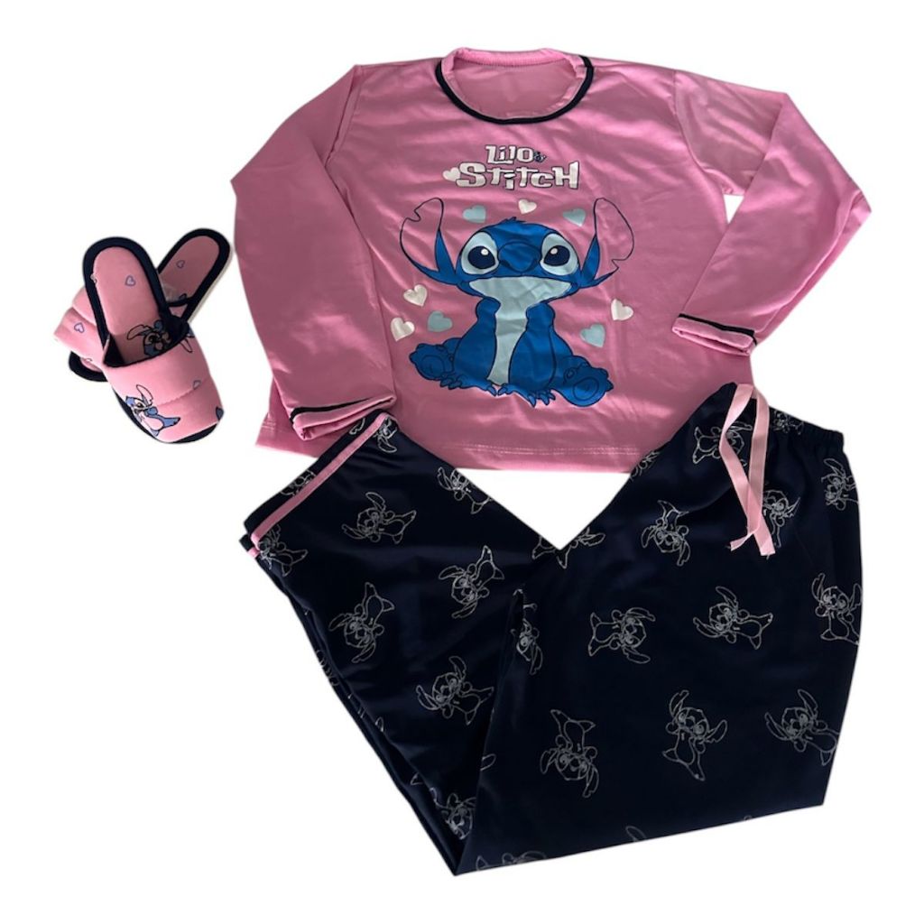 Kit 1 Pijama longo Infantil +1 Pantufa Infantil Blogueirinha Estampa Personagens de frio inverno Stitch Festa Do Pijama