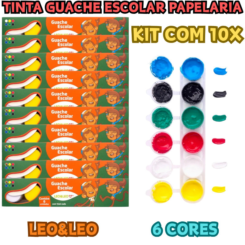 Kit 10 Leo&Leo Tinta Guache 6 Cores Escolar Papelaria Vibrantes Pote 15ml Pigmentada Multicolorido