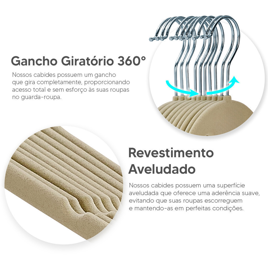Kit 100 Cabides Veludo Slim Antideslizante Ultra Fino Preto Bege Cinza