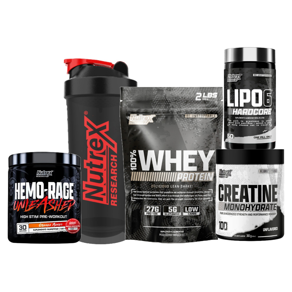 Kit 100% Whey 900g + Hemo-Rage 180g + Creatina 300g + Lipo 6 Hardcore 60caps + Coqueteleira Nutrex Máxima Performance