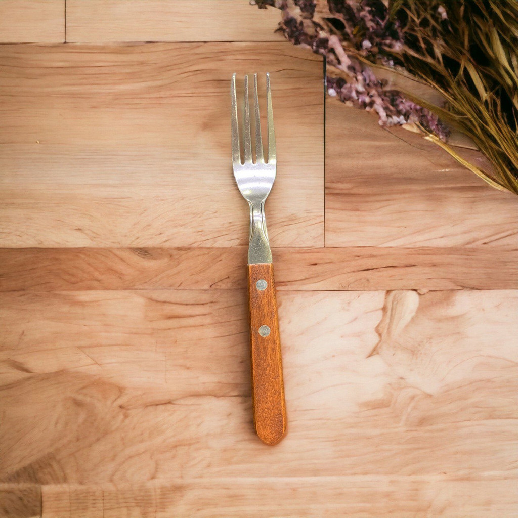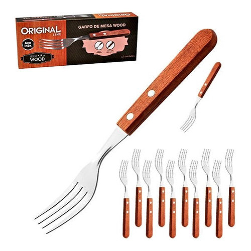 Kit 12 Garfo De Mesa De Inox Cabo Madeira Marrom Wood