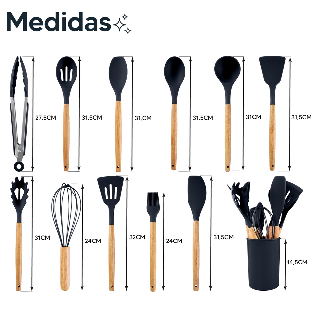 Kit 12 Utensílios Cozinha Completo Silicone Cabo De Madeira Premium Com Copo Suporte para Armazenar