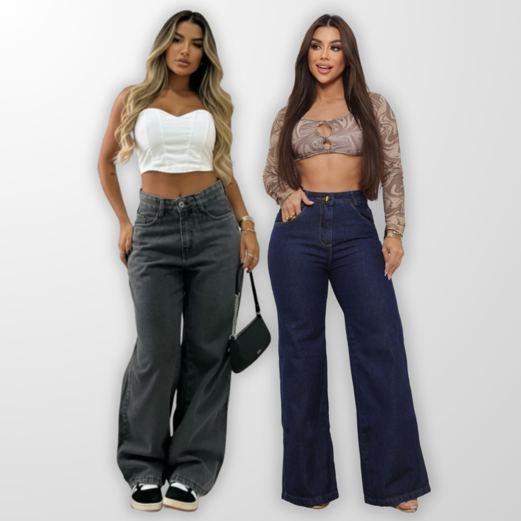 Kit 2 Calças Jeans Wid Leg Cos Alto Aumenta Bumbum Moda Feminina