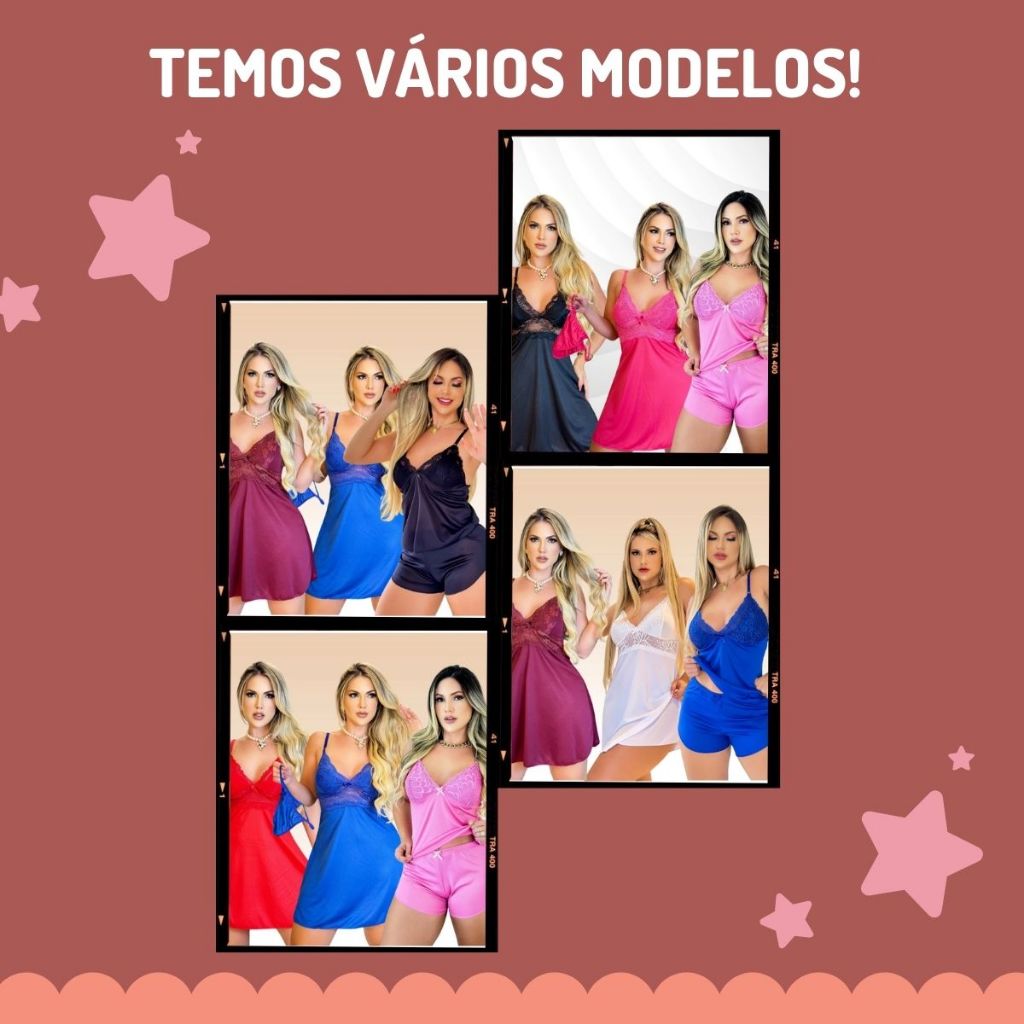 Kit 2 Camisolas + 1 Baby Doll Pijama Feminino Com Calcinha Sensual Traje De Dormir Sem Bojo