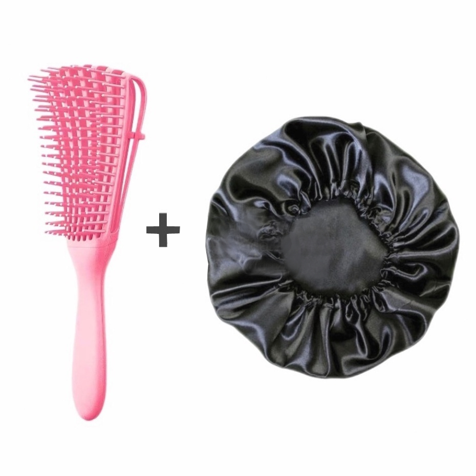 Kit 2 Com Escova Para Cabelos Pente Polvo Massageador Multifuncional + Touca de Cetim Antifrizz Impermeável - WL