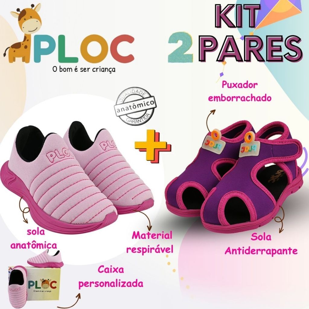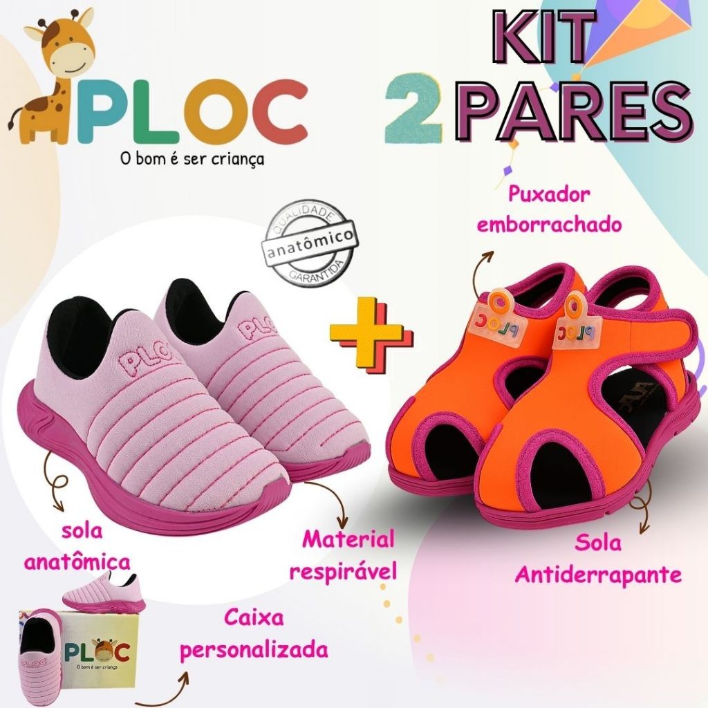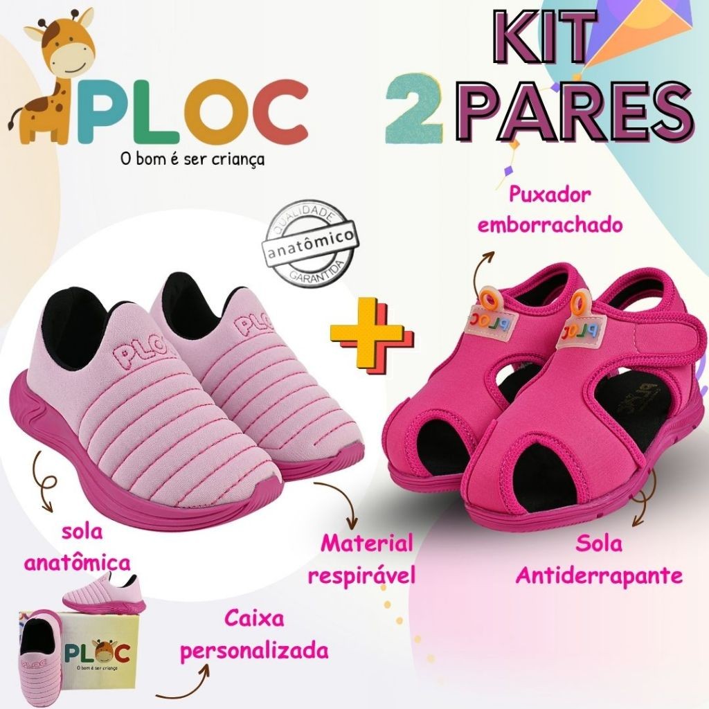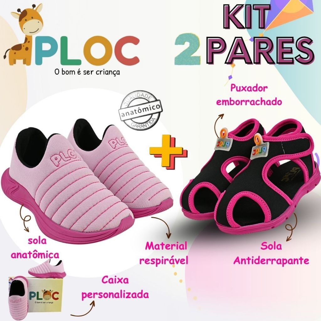 Kit 2 Pares: Calce Fácil Colors Rosa sola Pink + Papete Menina Ploc Pap01