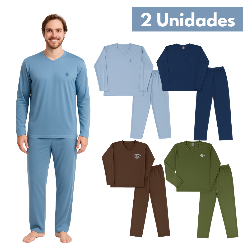 Kit 2 Pijamas Longo Adulto Masculino Manga Comprida Bordado Sortido P ao GG
