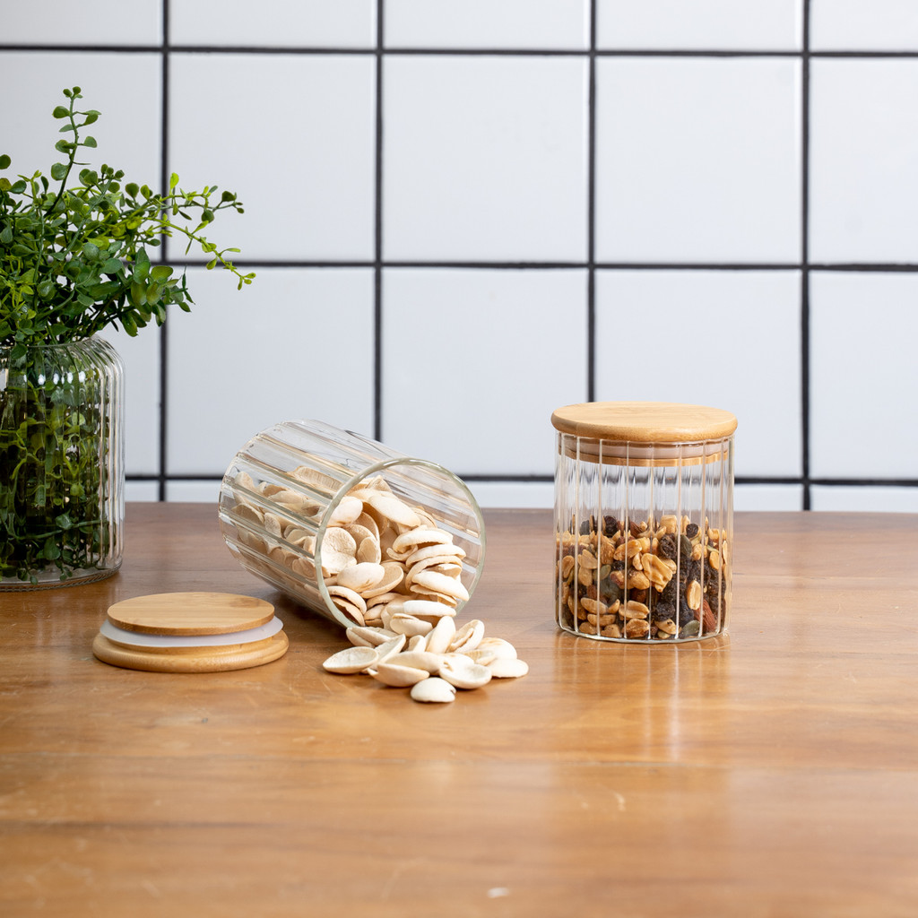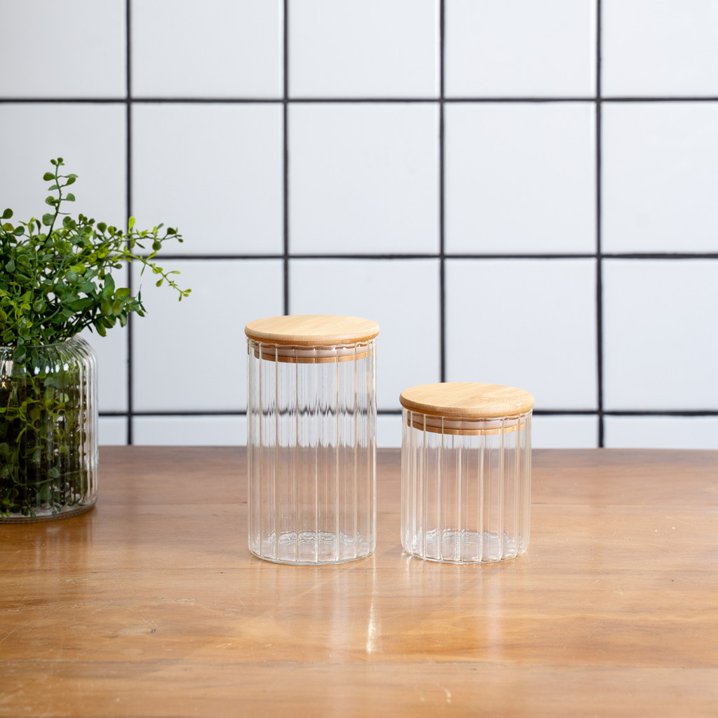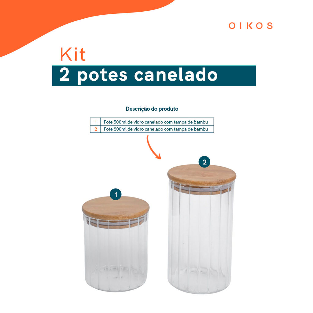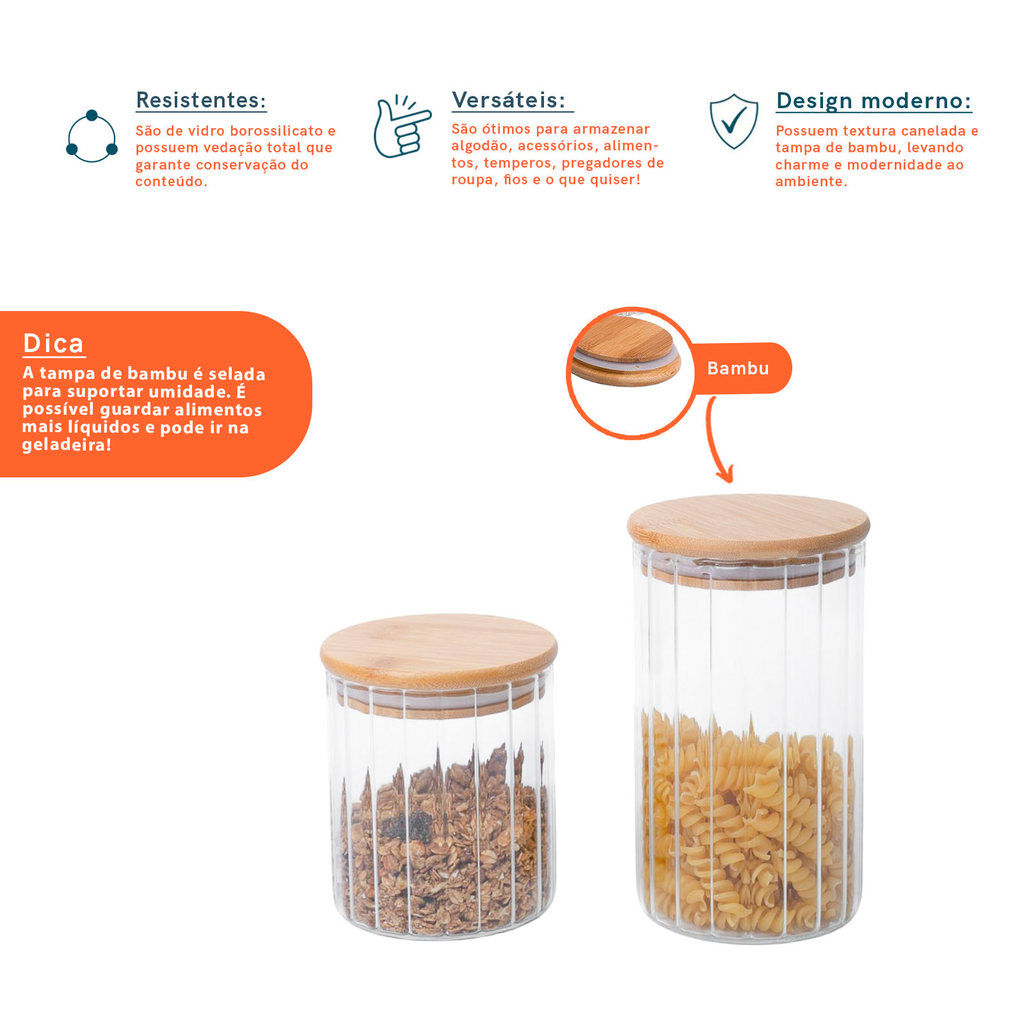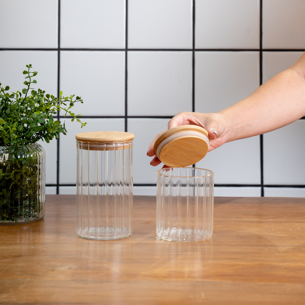 Kit 2 Potes Vidro Herméticos Para Mantimentos Canelado com Tampa de Bambu - Oikos