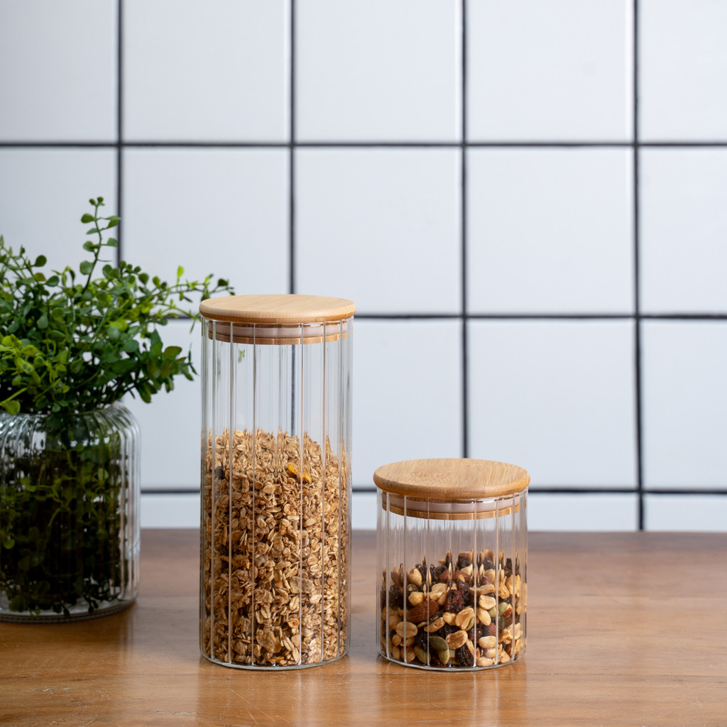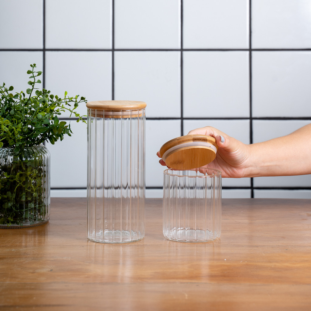 Kit 2 Potes Vidro Herméticos Para Mantimentos Canelado com Tampa de Bambu - Oikos