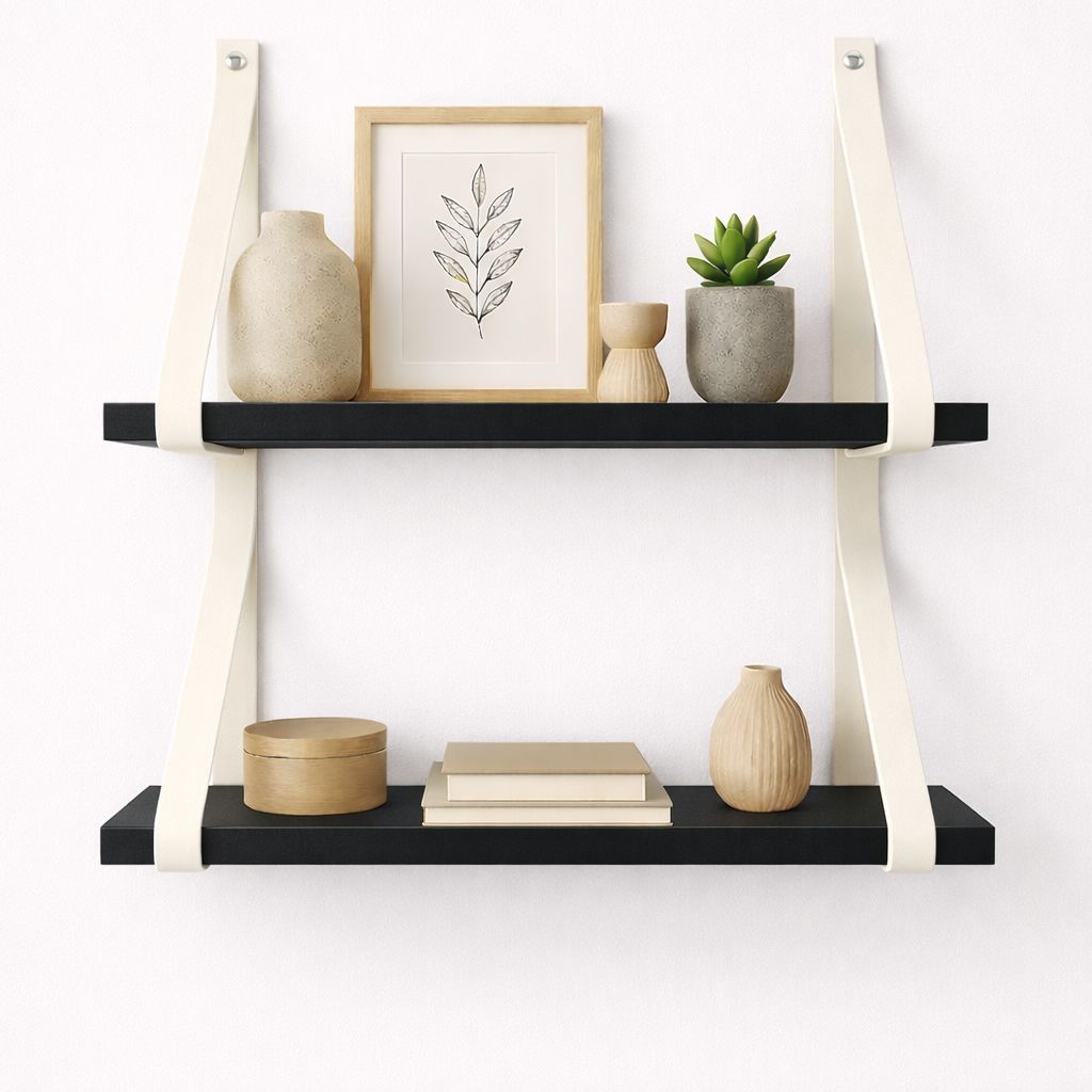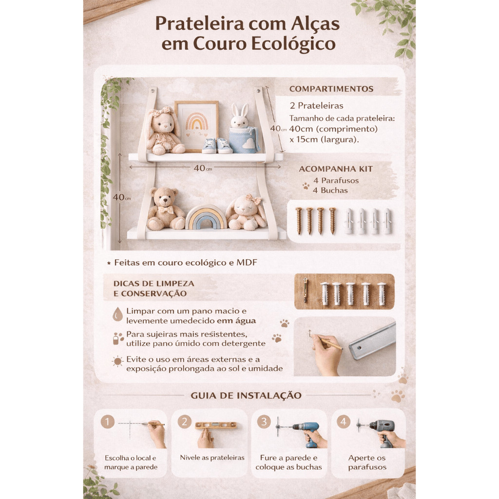 Kit 2 Prateleiras 40x15 cm de MDF Alças de Couro Fácil Instalação Multifuncional Decoração Livros