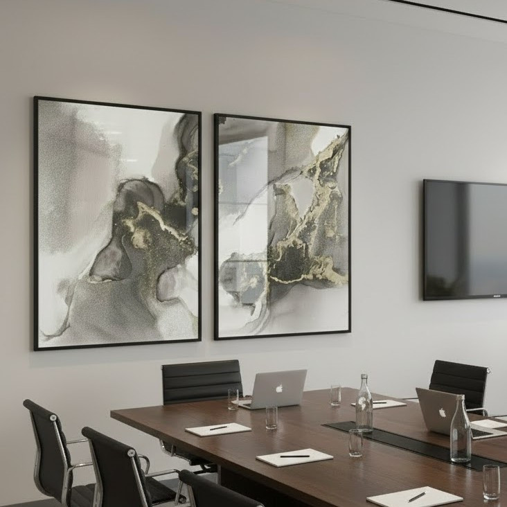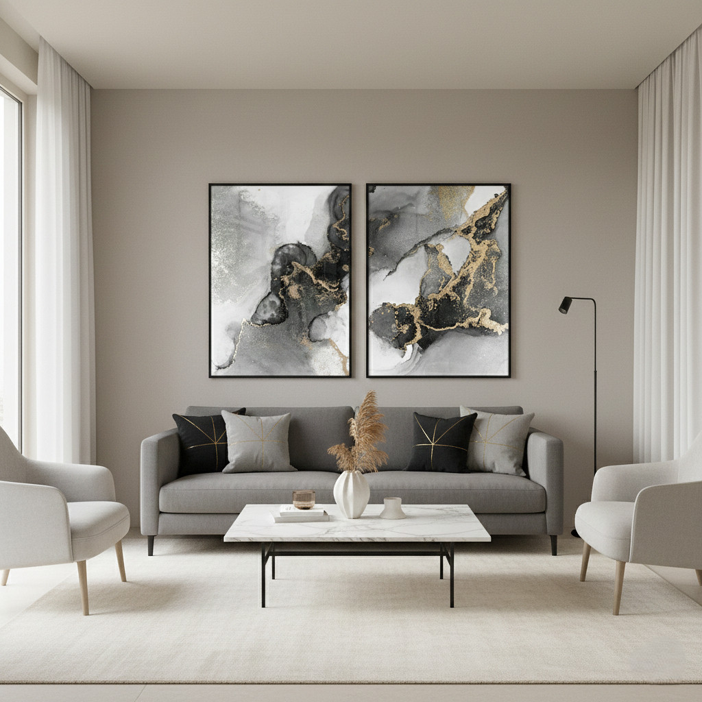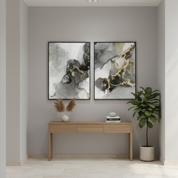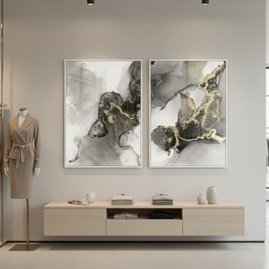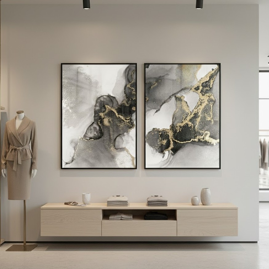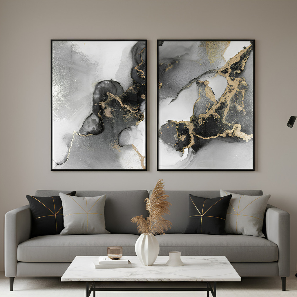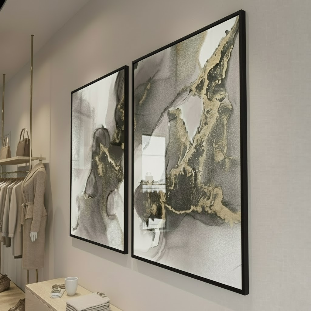 Kit 2 Quadros Abstratos Luxo Preto E Dourado Sala Com Vidro
