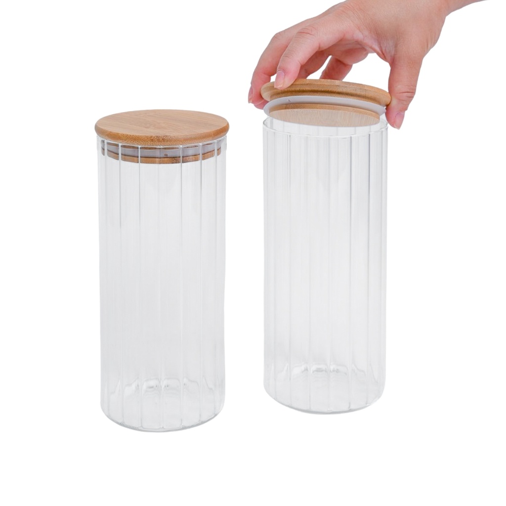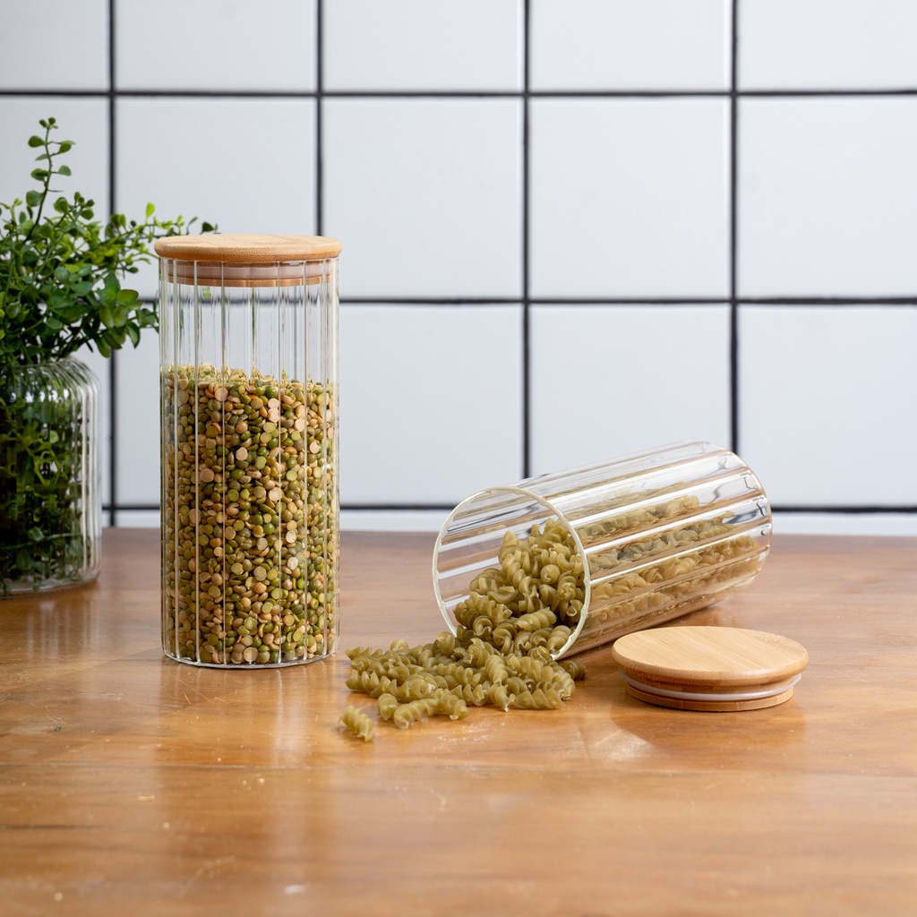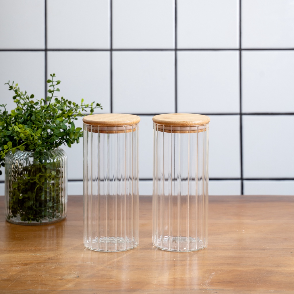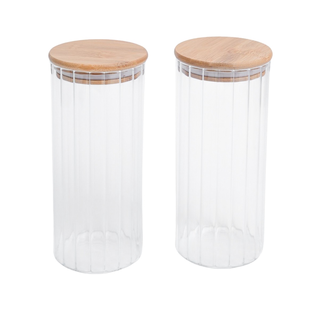 Kit 2 potes vidro canelado com tampa de bambu 1100ml - Oikos