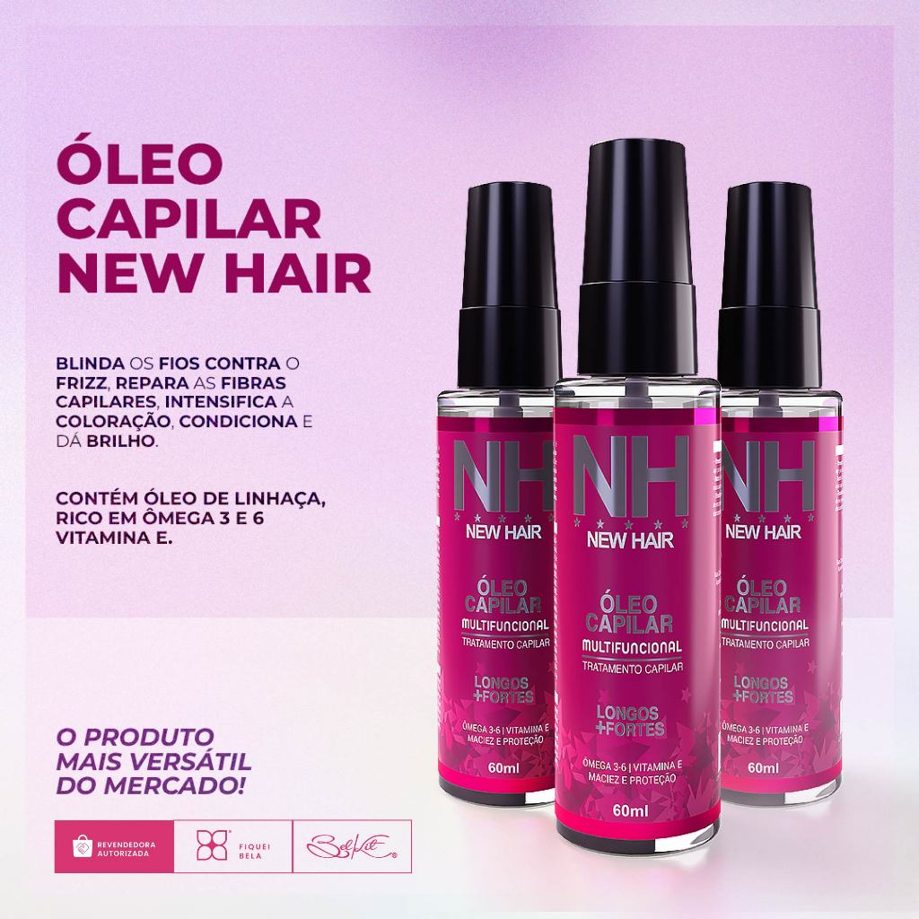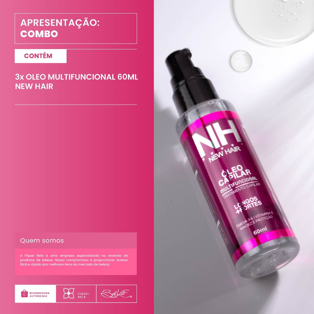 Kit 3 Óleo Multifuncional 60ml Tratamento Capilar Fios mais Longos e Fortes New Hair Belkit